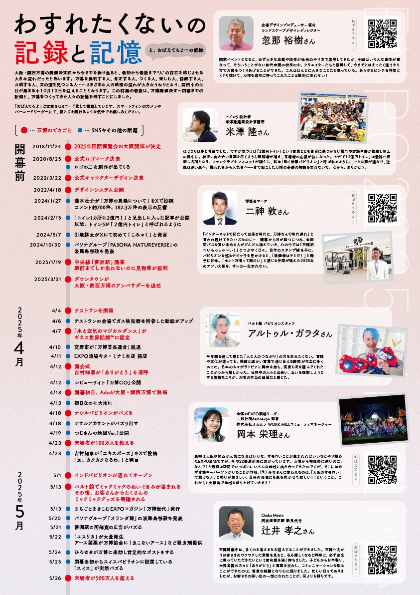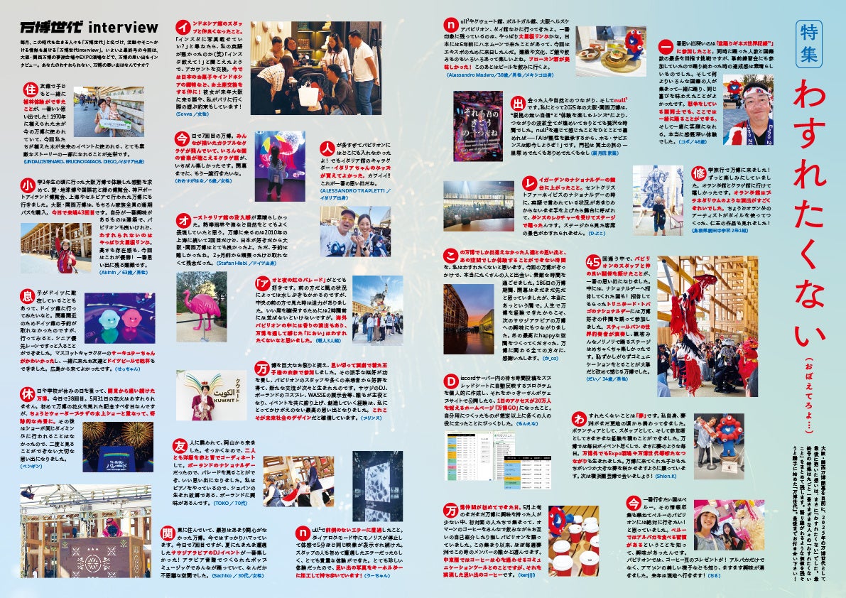 最終号となる今号のテーマは、「わすれたくない(おぼえてろよ…)」です。万博に訪れた一般来場者から実際に万博に仕事で関わった方々、万博マニアの方々など多方面に「わすれられない万博の思い出」を独自取材しました。また、思い出だけではなく万博で学んだことを次に活かすための「おぼえてろよ…」も合わせて聞いています。この大阪・関西万博の記録としても貴重かつ、他誌では読めない深く濃い内容は、最終号に相応しい総力特集号です