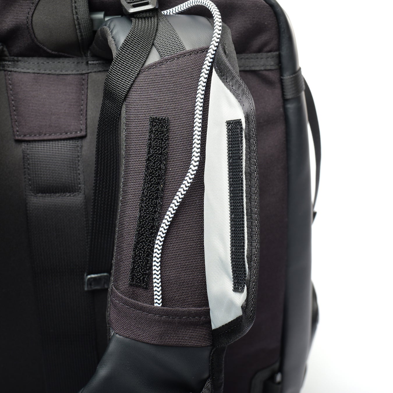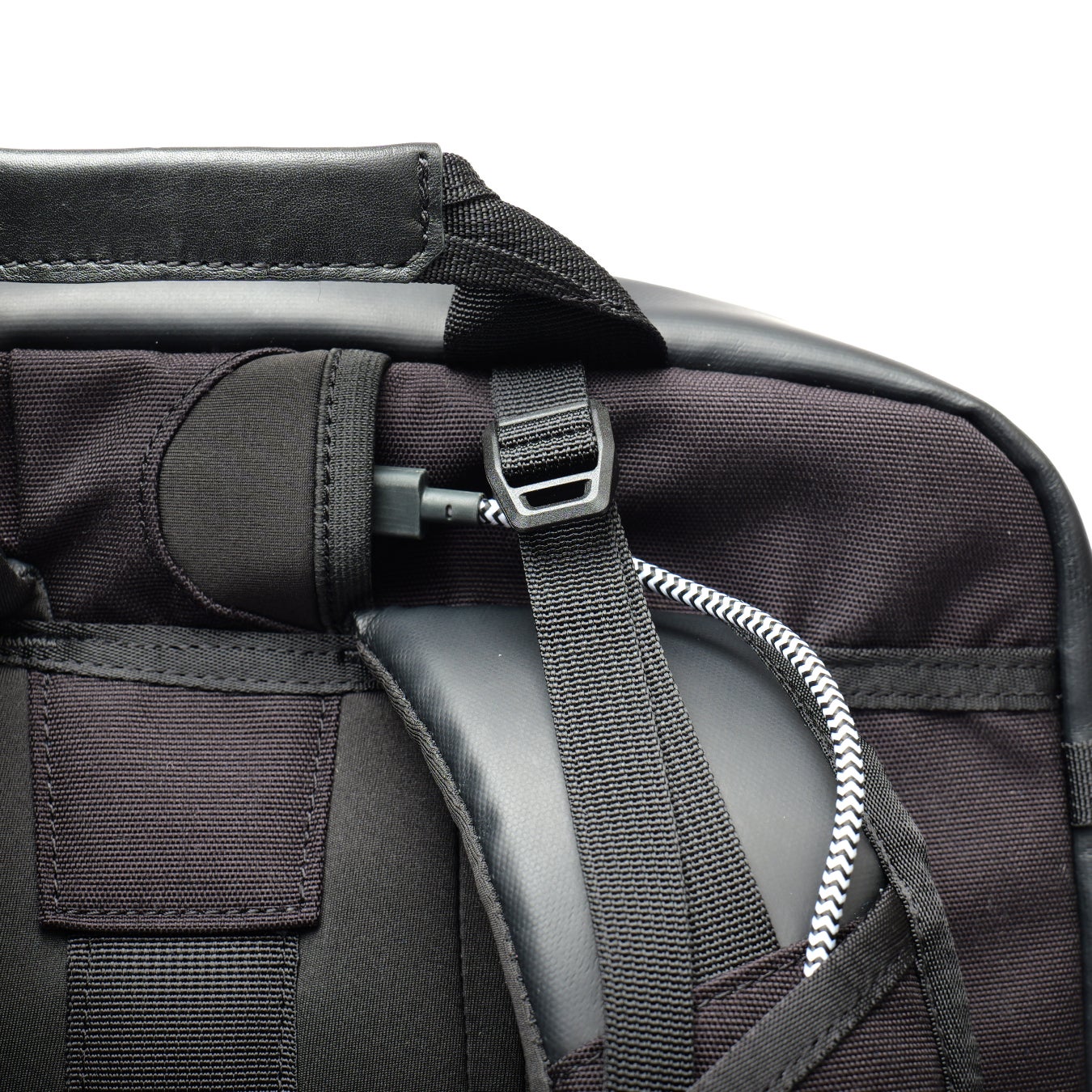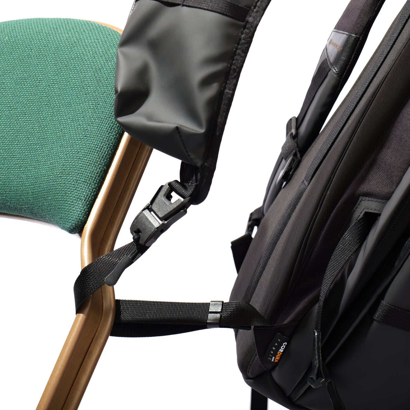 バッグのハーネスを椅子の脚などに固定できる盗難防止機能。カフェなどでのPC作業も安心です。