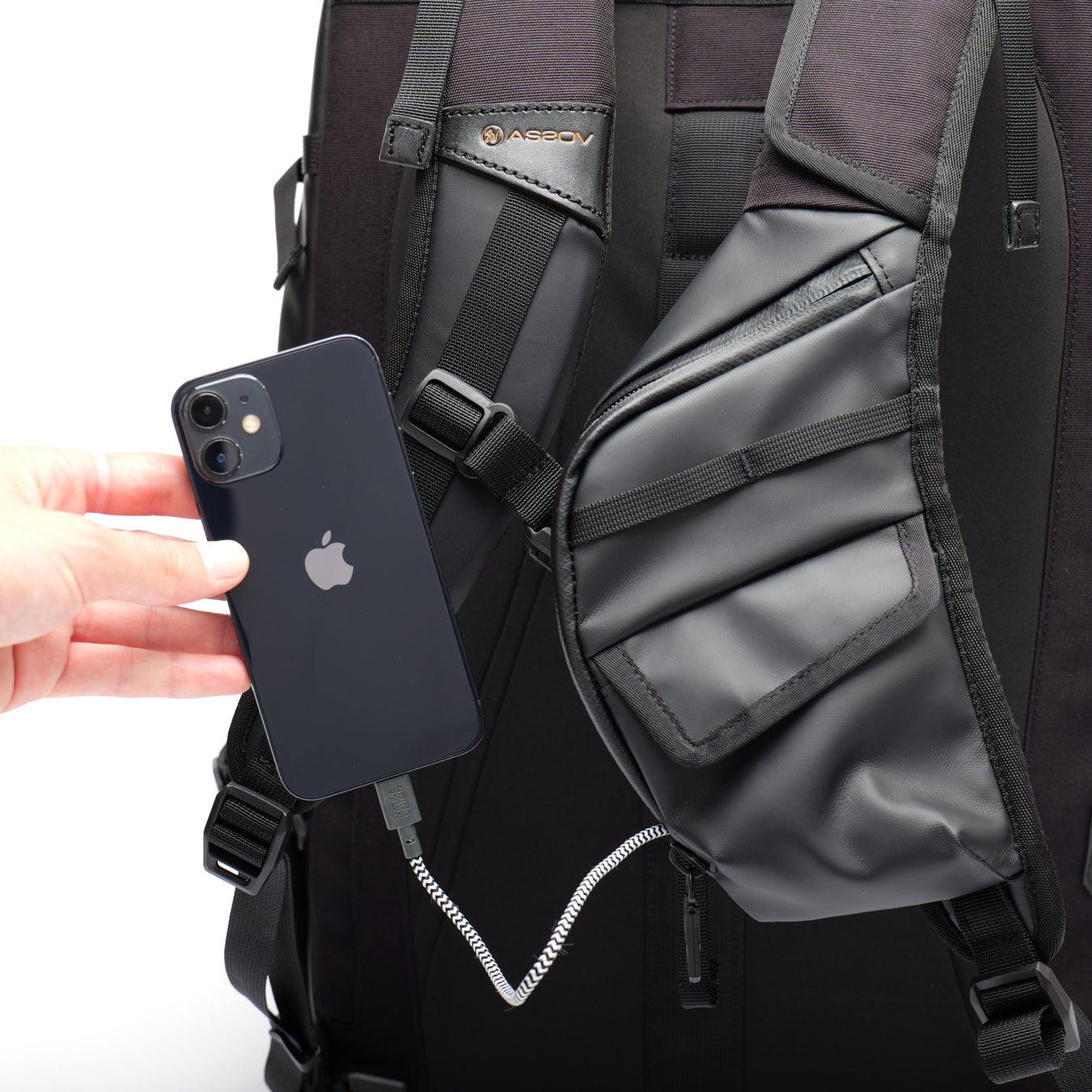 ハーネス部分に装備されたポケット。内部のモバイルバッテリーからUSB-Cケーブルを通して、スマートフォンを収納しながら充電できます。