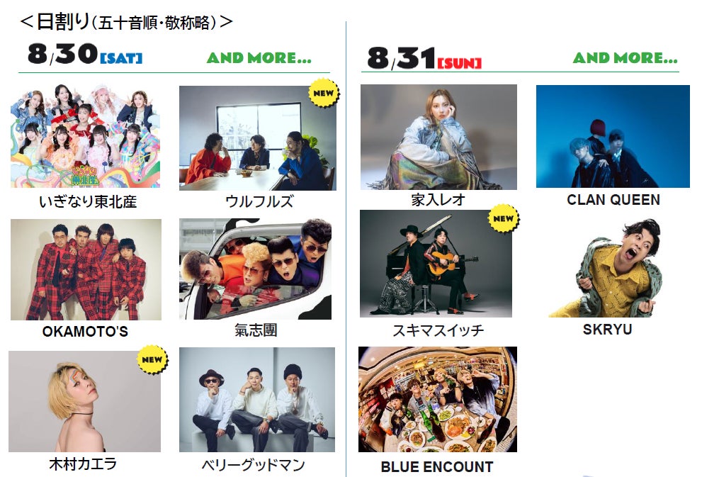 家入レオ・いぎなり東北産・ウルフルズ【NEW】・OKAMOTO'S・氣志團・木村カエラ【NEW】・