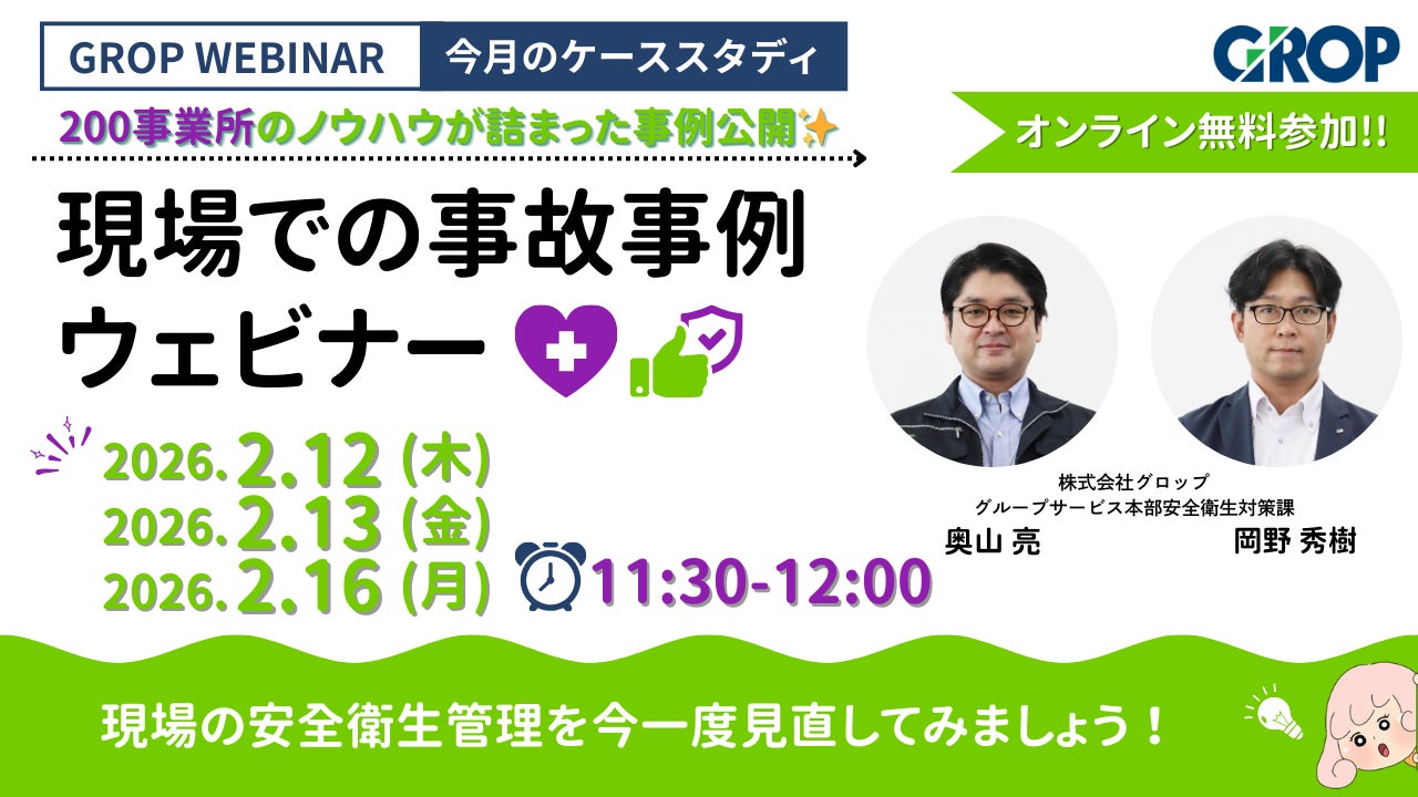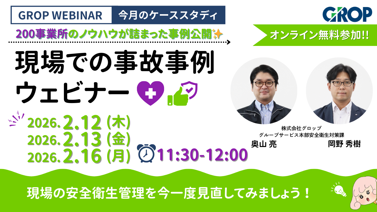 そんな課題に応えるため、株式会社グロップが現場の安全衛生を徹底サポートするウェビナーを開催します。このウェビナーでは、最新の事故事例をもとに、事故防止のための具体的なポイントや即活用できるノウハウを詳しく解説します。現場の安全に関する新しい視点を取り入れ、より強固な対策を構築する絶好の機会です!