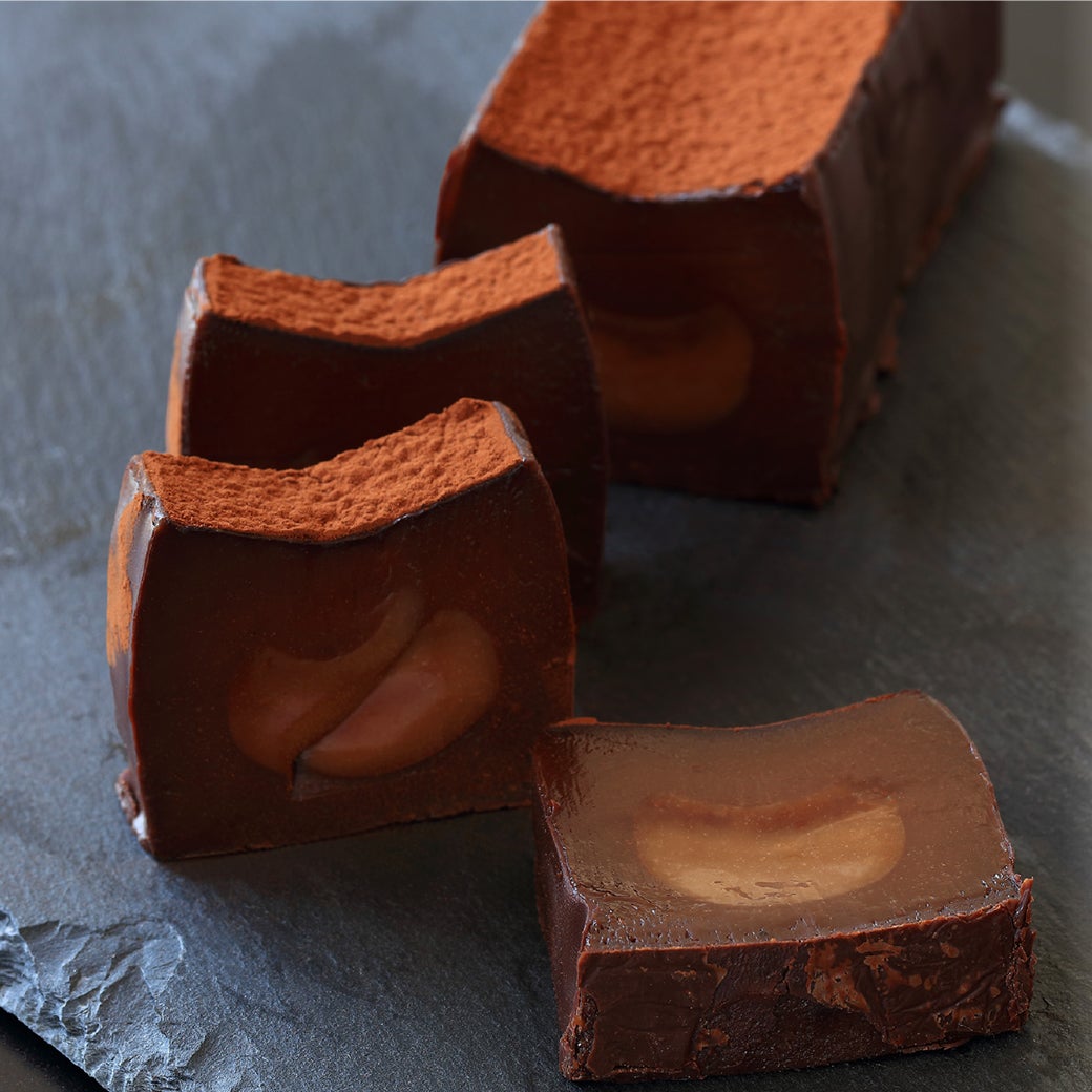 フランス産の高級チョコレートを贅沢に使用した、カカオ香るチョコレートテリーヌ。小麦粉を使わないことでしっとりとなめらかな食感を追求し、さらにとろ~り濃厚なキャラメルチョコレートを内側に閉じ込め、他にはない二重の美味しさと驚きを感じていただけます。