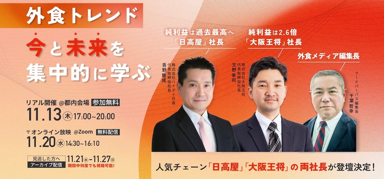 変化の激しい市場環境の中で、両社ではどのように顧客ニーズを捉え、事業を成長させてきたのか、また今後の外食産業がどの方向へ進んでいくのかを、具体的な戦略や取り組み事例を交えながら語っていただきます。