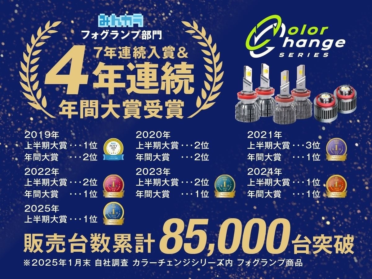 また、人気の「カラーチェンジシリーズ」フォグランプ商品は、累計販売台数85,000台を突破しております(2025年1月末時点・自社調査)。