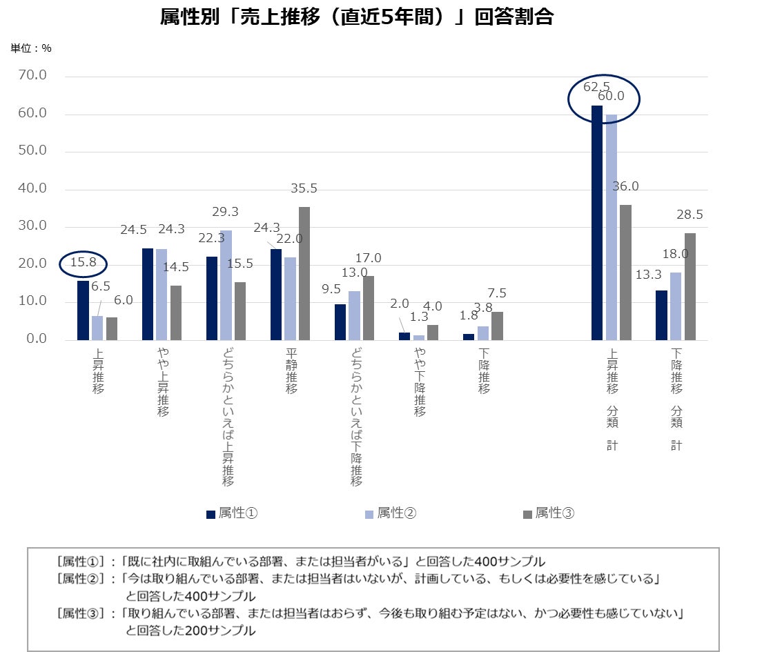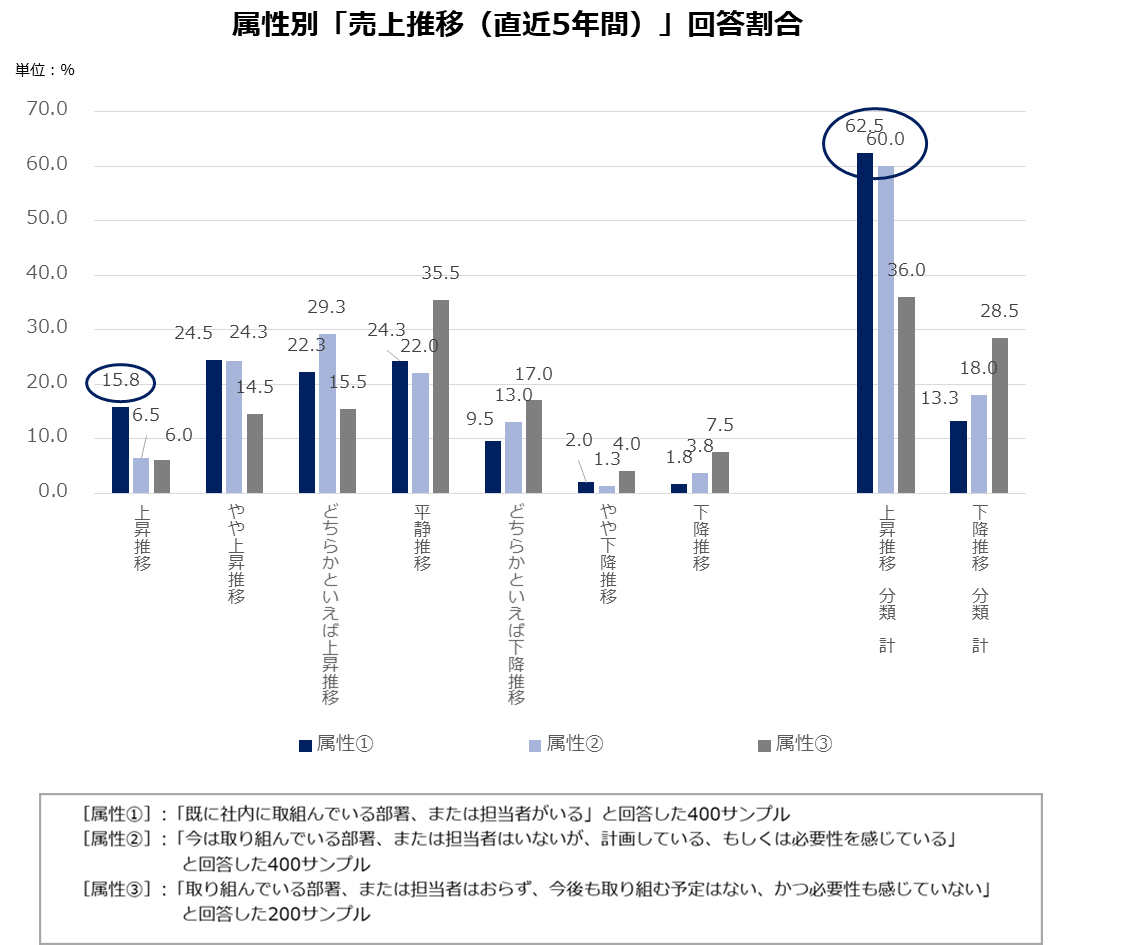 直近5年間の売上が「上昇推移」であると回答した企業を見ると、「既に社内に取組んでいる部署、または担当者がいる」(=[属性①])の回答割合が他の属性②③に比べて最も高い状況です。