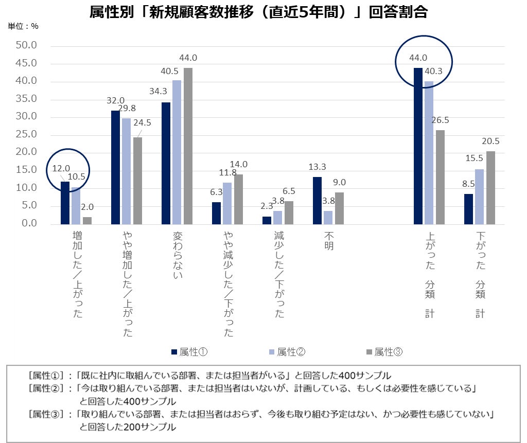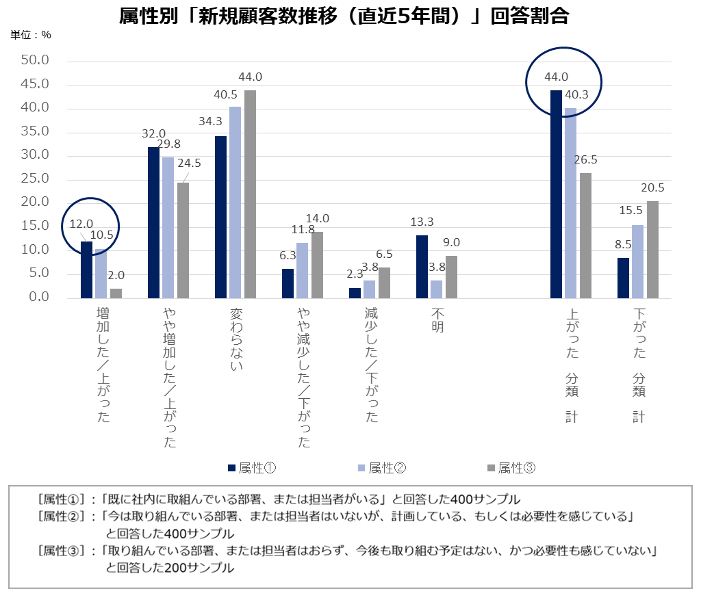 直近5年間の「新規顧客数」推移のまとめとしては、属性①②の「増加した/上がった」回答割合が[属性③]と比べて顕著に高く、加えて属性①②の「上がった 分類 計」回答割合が属性③に比べて顕著に高く、属性①②と属性③に大きな違いが見受けられました。