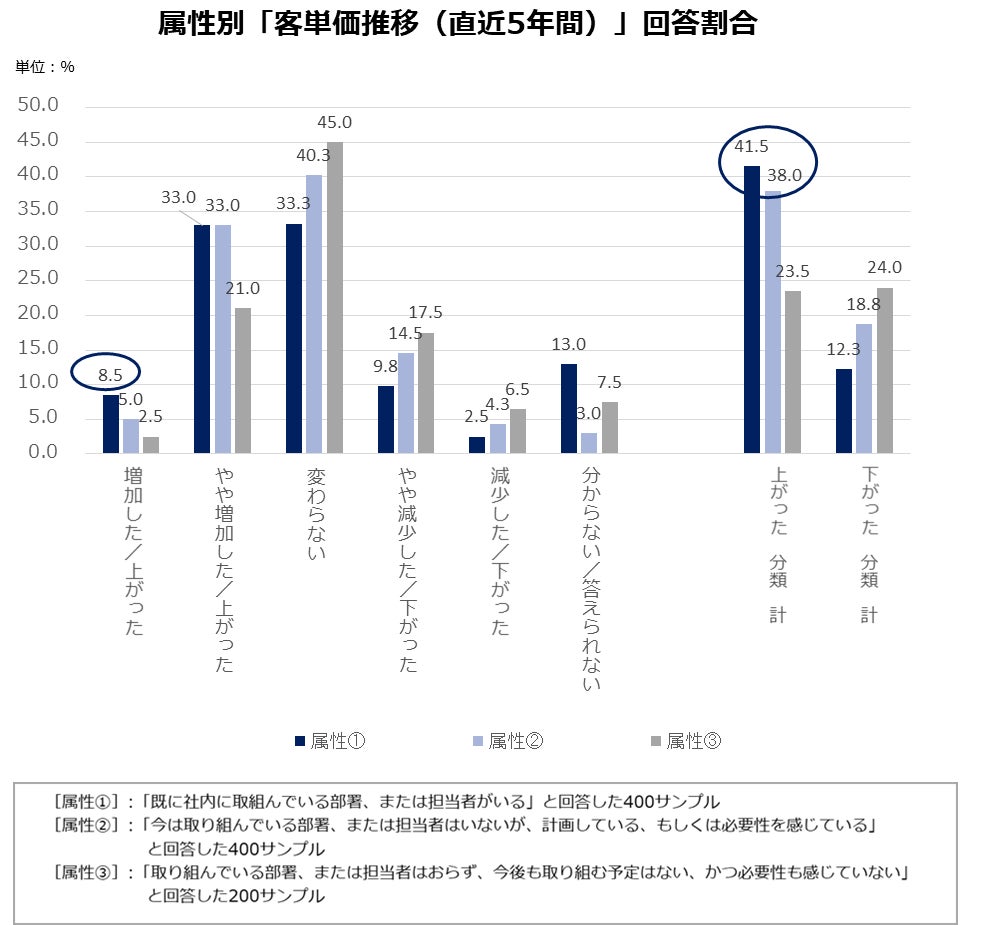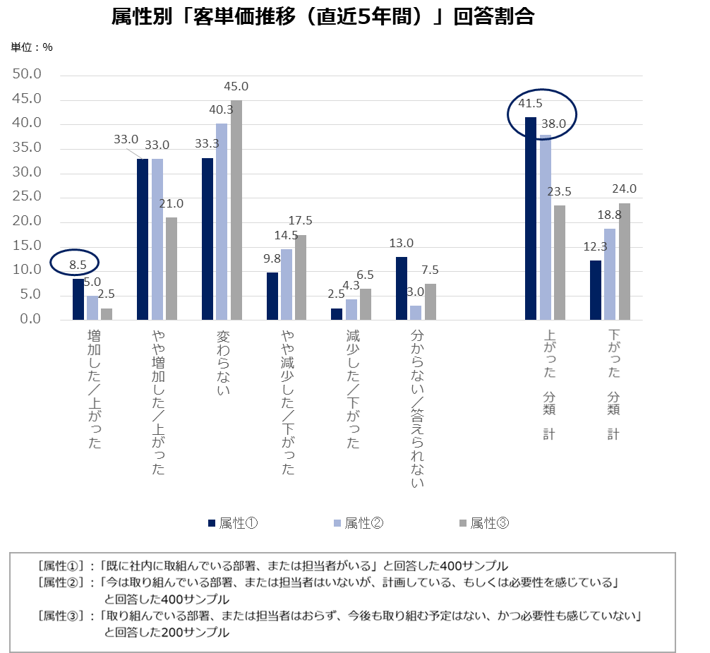 直近5年間の「客単価」推移のまとめとしては、属性①の「増加した/上がった」回答割合が属性②および[属性③]と比べて顕著に高く、加えて属性①②の「上がった 分類 計」回答割合が属性③に比べて顕著に高く、属性①②と属性③に大きな違いが見受けられました。