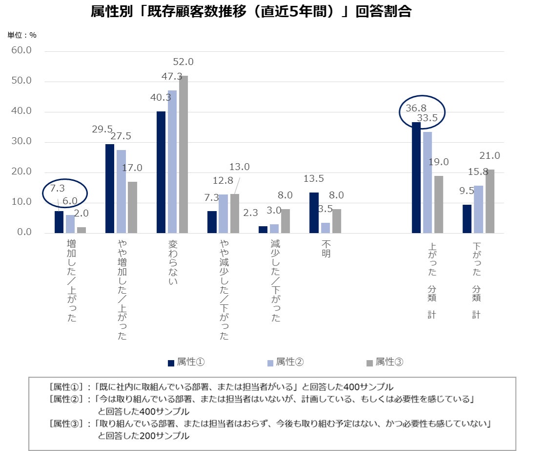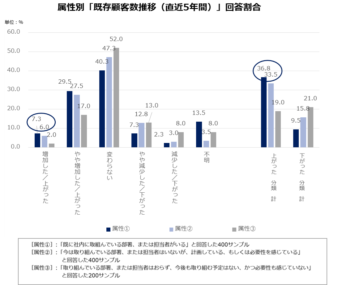 直近5年間の「既存顧客数」推移のまとめとしては、属性①②の「増加した/上がった」回答割合が属性③と比べて顕著に高く、加えて属性①②の「上がった 分類 計」回答割合も属性③に比べて顕著に高いため、属性①②と属性③に大きな違いが見受けられました。