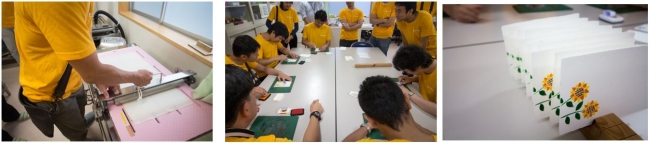 スタディツアーでは、ハガキの作成をお手伝いしました。のぞみ福祉作業所で働く方々に、作業工程を教えていただきながら、手漉きのむずかしさや、ステンシルのデザインの楽しさを体験することができました。このカードをたくさんの方にお届けできるよう、引き続き支援を続けていきたいと考えています。