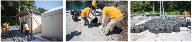 また、当日は、漁船を停泊させる上で必要となる土嚢づくりをお手伝いしました。普段は5名で作業している作業を、19名のショップジャパンの社員が手分けして実施。手作業ですべて行うことの大変さを痛感しました。