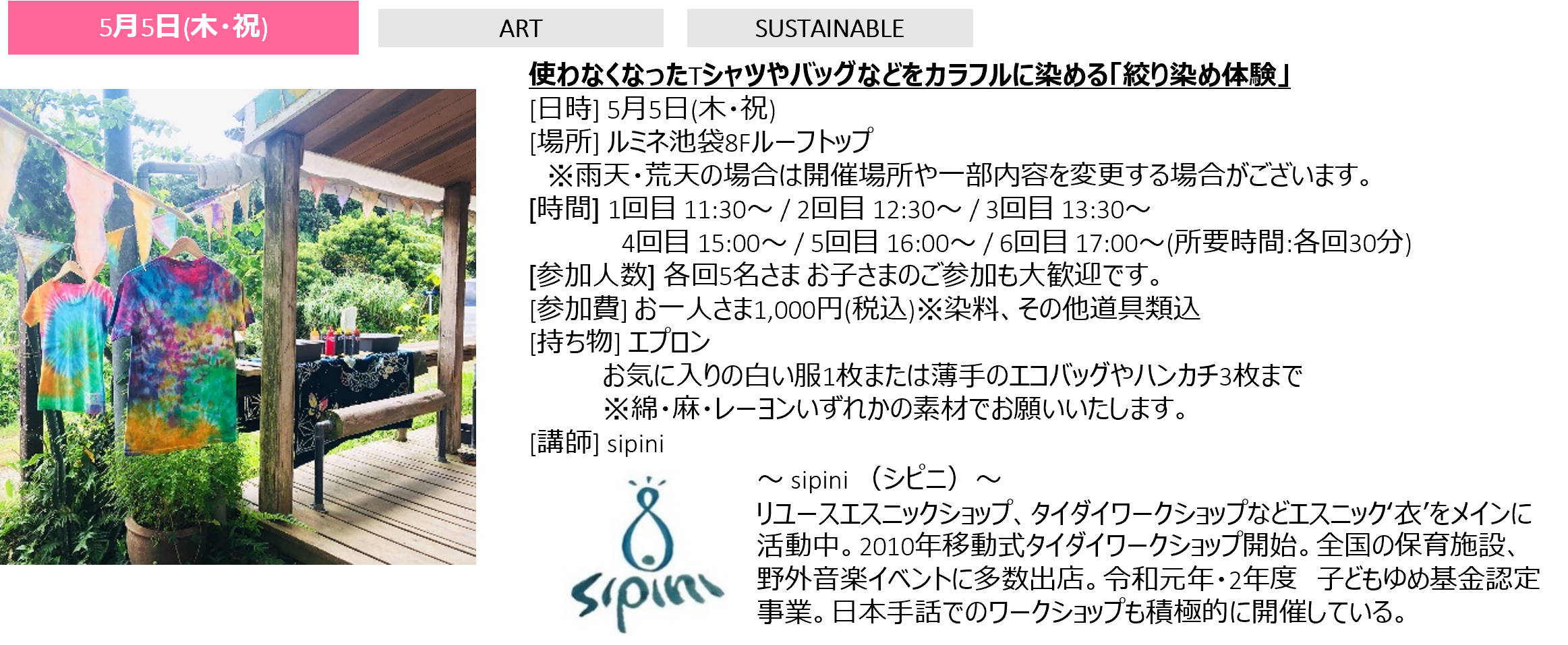 ③クローゼットに眠っている衣類をオンリーワンの一枚に「カラフル絞り染め体験」(主催者:sipini)