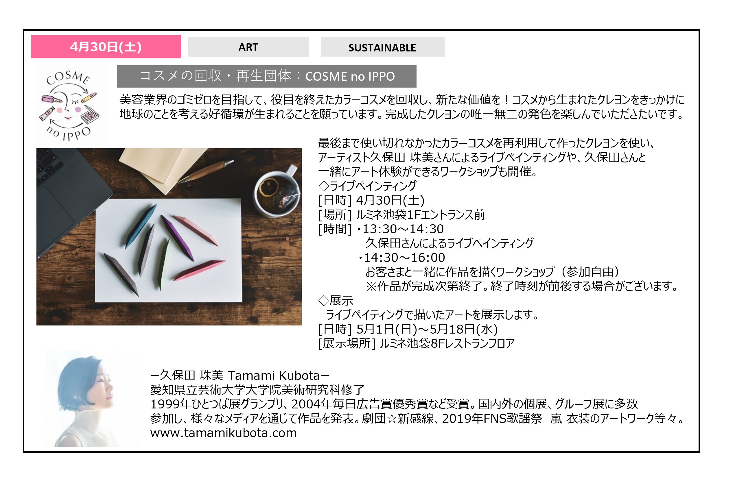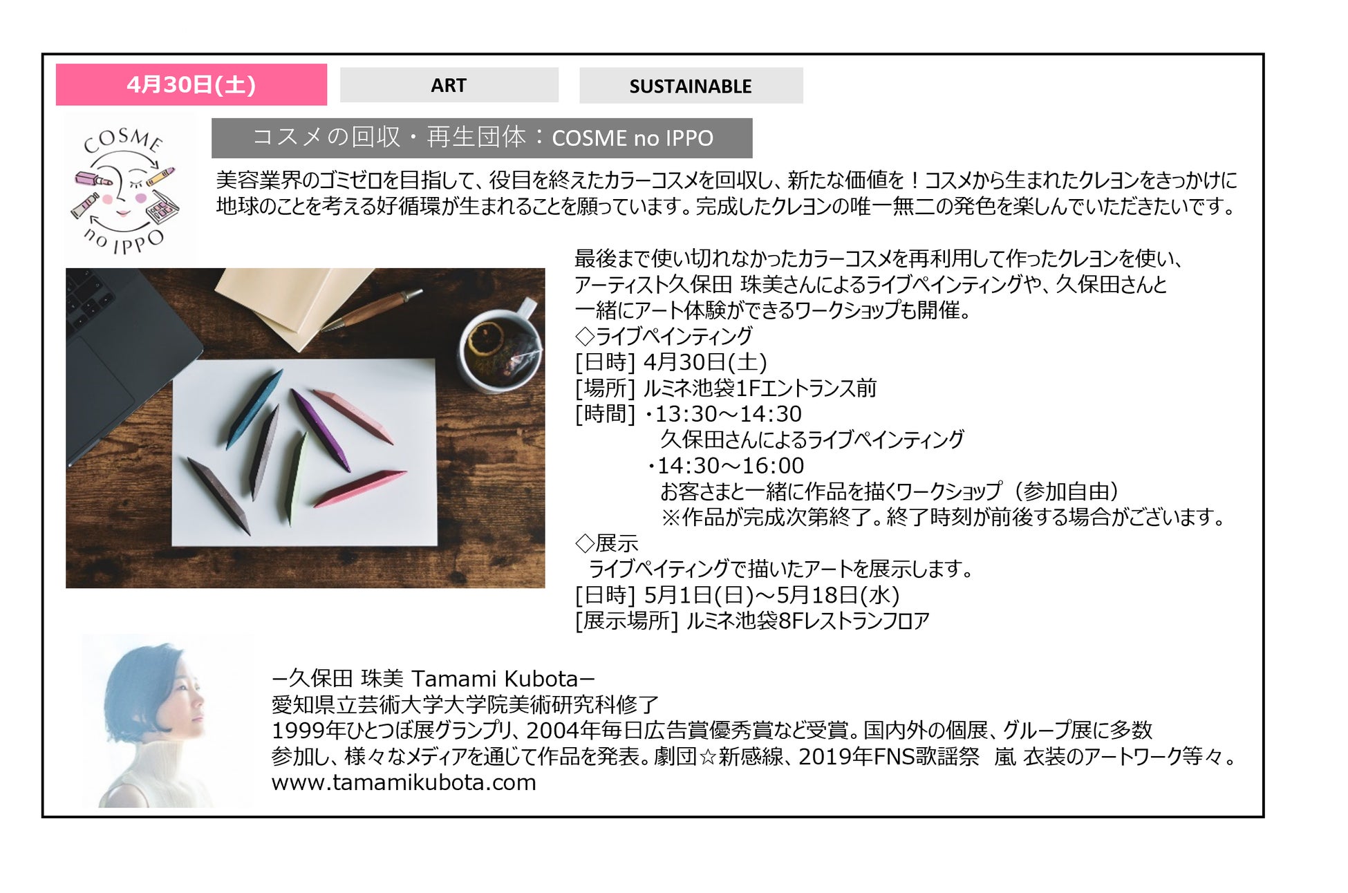 4月30日(土)は、最後まで使い切れなかったカラーコスメを再利用して作ったクレヨンを使い、アーティスト久保田 珠美さんによるライブペインティングや、久保田さんと一緒にアート体験ができるワークショップを開催いたします。