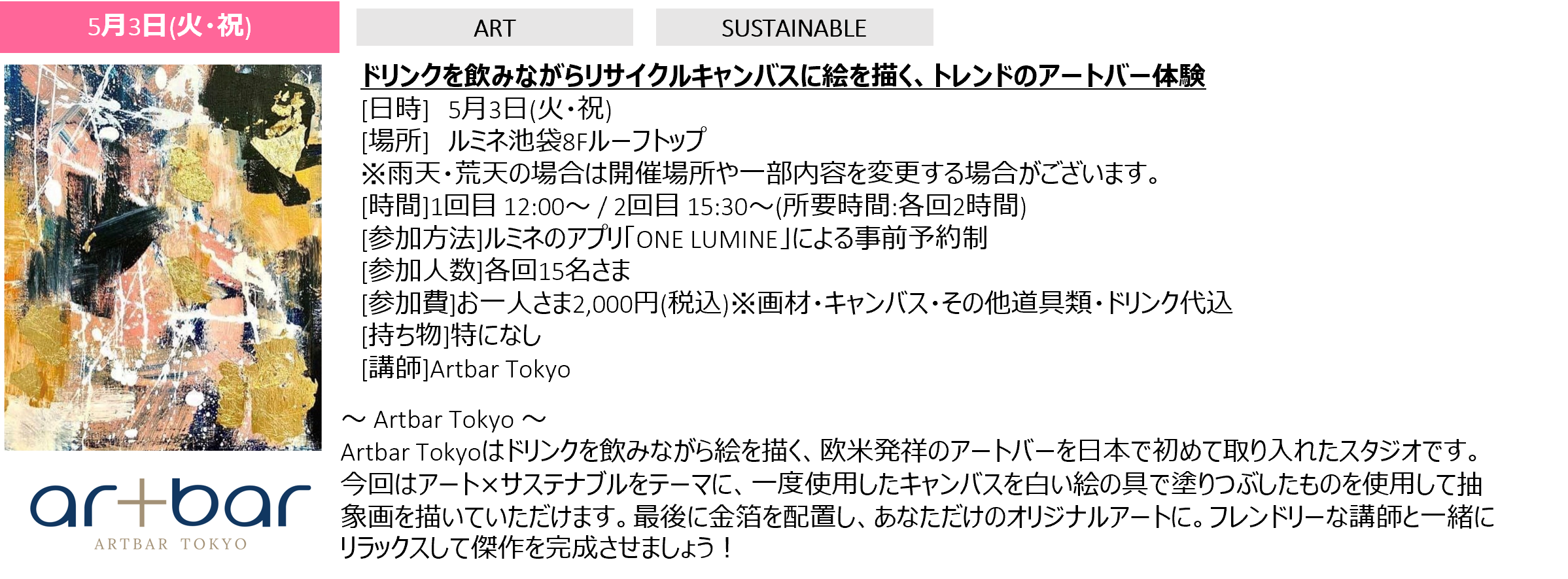 その他、5月3日(火・祝)にはドリンクを飲みながらリサイクルキャンバスに絵を描く、欧米発祥のアートバーが体験できる「Usedキャンバスで金箔抽象画」を開催。金箔を配置したオリジナルアートを制作いただけます。5月4日(水・祝)には廃棄予定のお花を使った「サステナブルフラワーキャンドルづくり」、5月5日(木・祝)には使わなくなったTシャツやバッグなどをオリジナルカラーに染める「カラフル絞り染め体験」の各種ワークショップを開催いたします(要事前予約)。