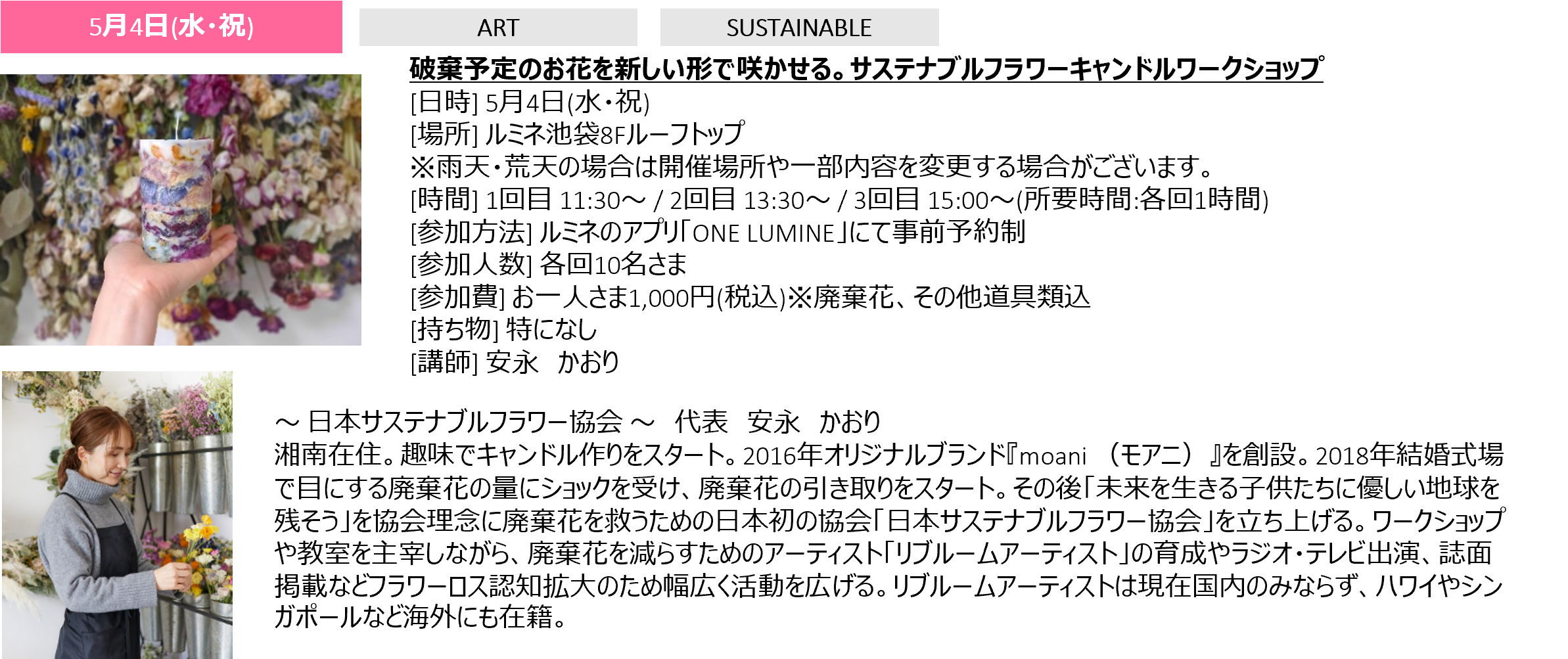②廃棄花が生まれ変わる「サステナブルフラワーキャンドルづくり」(主催者:日本サステナブルフラワー協会 安永かおり)