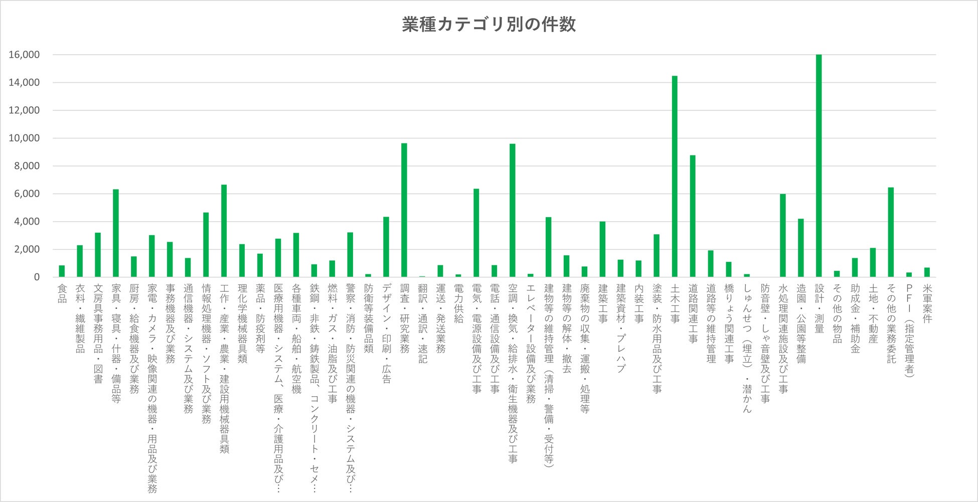複数の業種カテゴリが1案件に付与されることがあるため、業種カテゴリの合計件数が月別の入札・公募件数にはなりません。