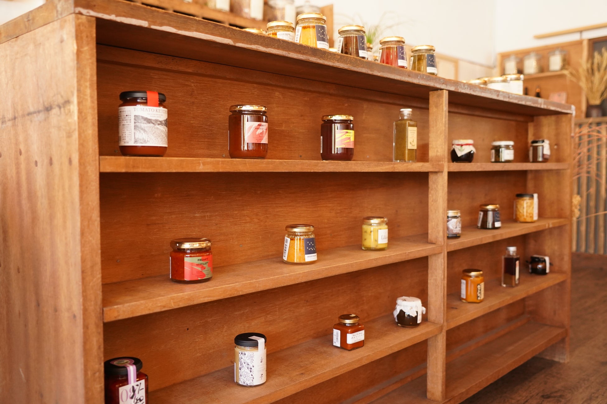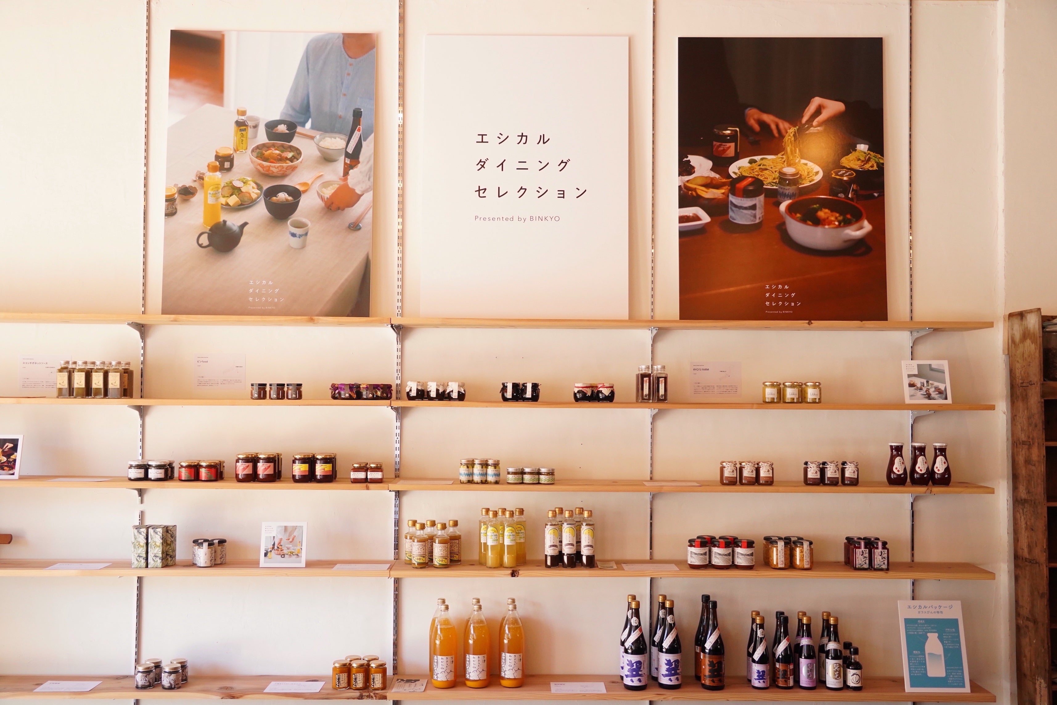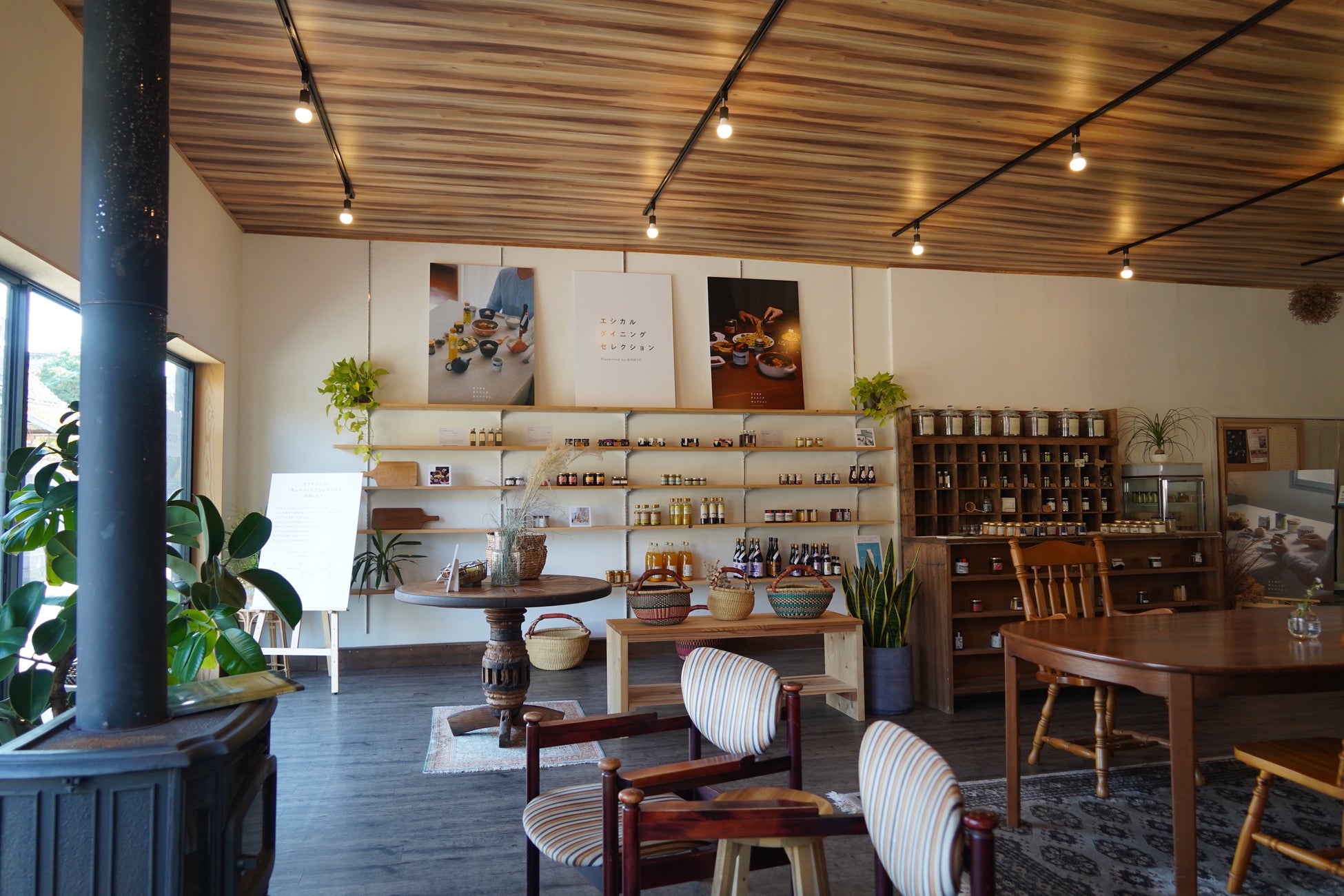 山口県下関市豊浦町の川棚温泉にあるエシカルマーケット。地域の想いのこもった商品や店主がセレクトした日用品が並ぶグロサリーストア。手作りの焼き菓子とオーガニックハーブティーなどを提供するカフェも併設している。