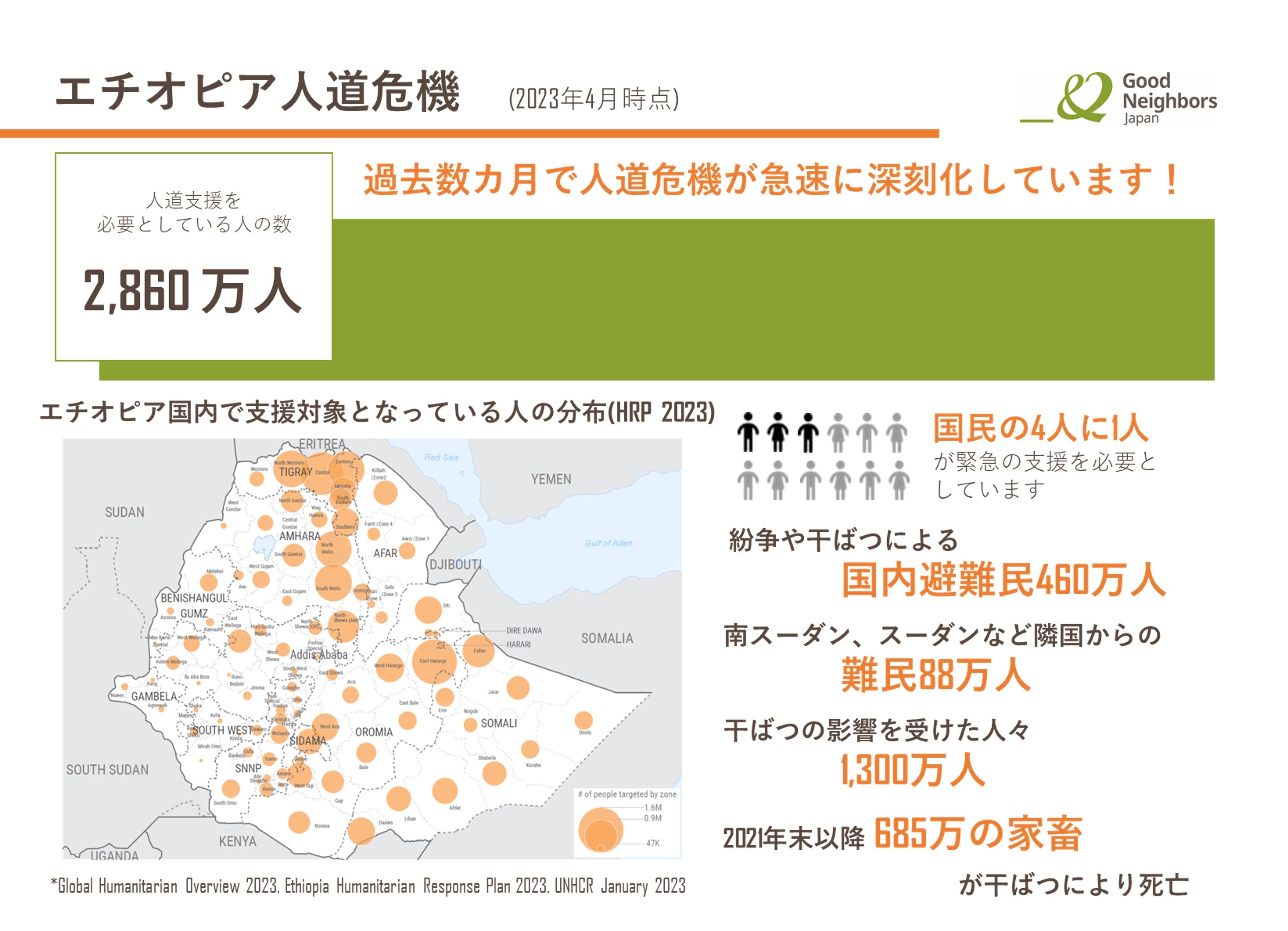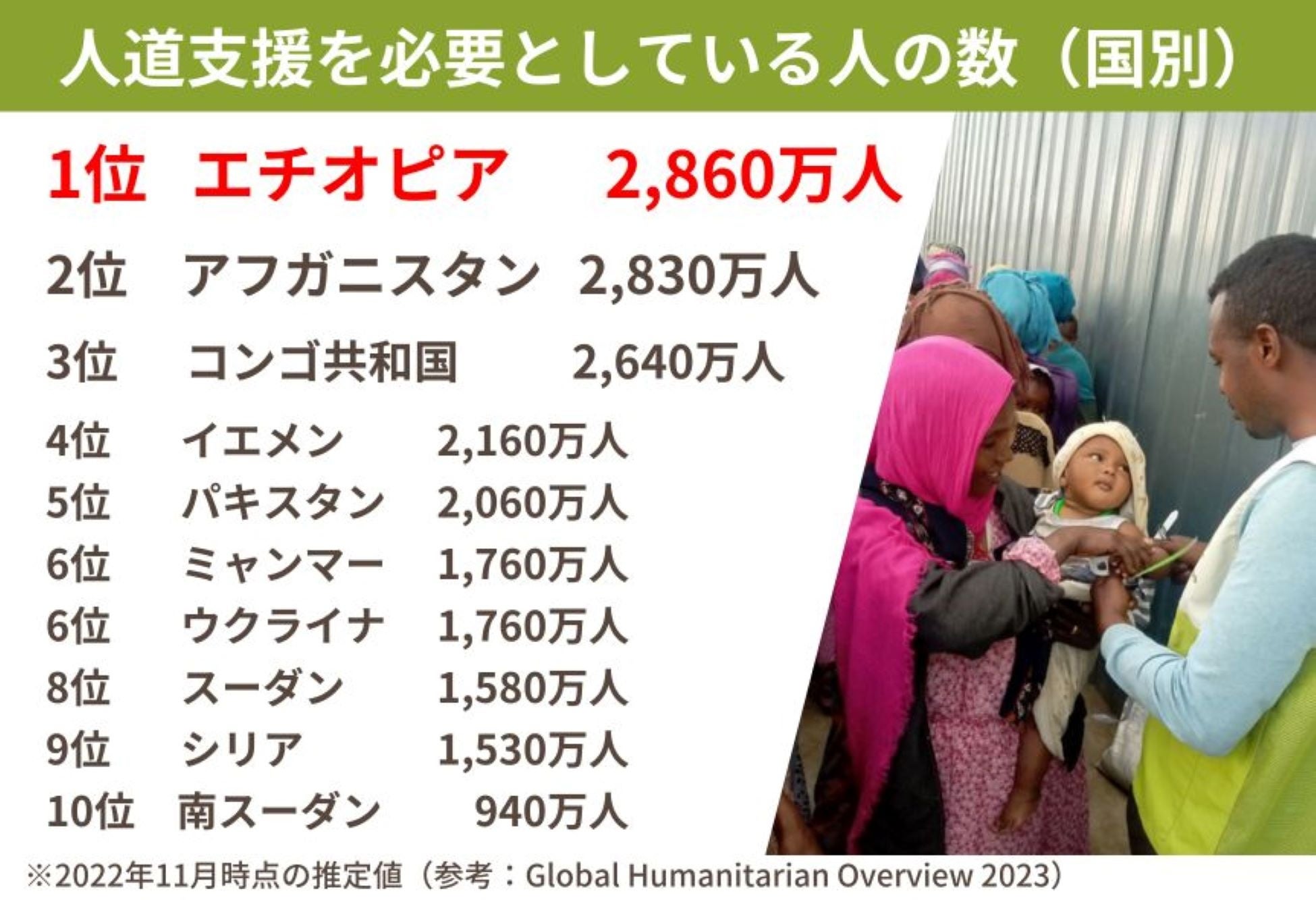 エチオピアでは、近年人道危機が急速に悪化しており、支援を必要とする人数は世界で最も多い2,860万人にのぼります[1]。