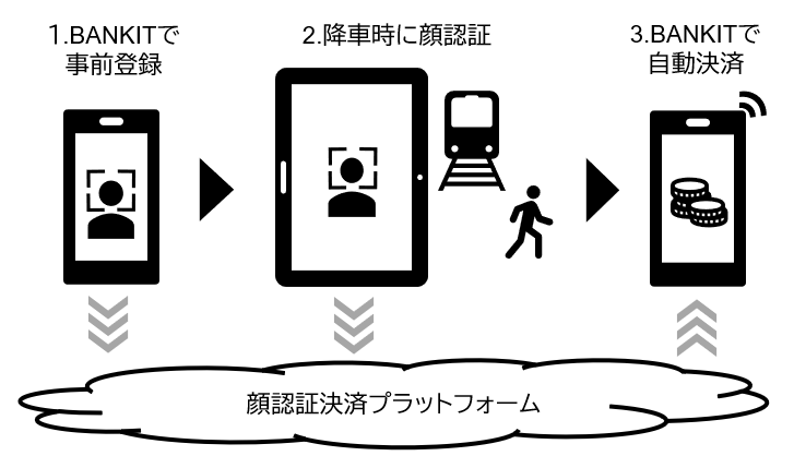 本実験のモニターは、「BANKIT®」上の顔認証ミニアプリを使ってご自身の顔画像を事前登録することにより、現金を使うことなく、手ぶらで熊本市電を利用することが可能となります。顔認証決済では、降車時に車両に取り付けられている顔認証用のタブレット型端末をのぞき込むだけで運賃を支払うことが可能であり、「顔パス」でご利用いただけます。なお、トラム(路面電車)の運賃を手ぶらでお支払いできるこの取り組みは、日本初となります。
