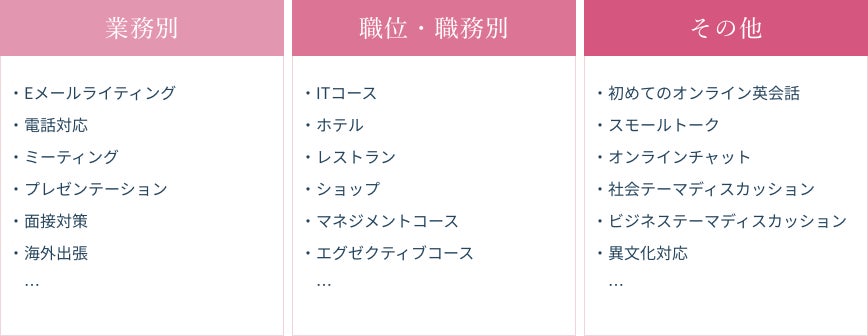 「Other Programs」は全38種類のビジネステーマから学びたいスキルを選択し、特定のビジネススキルを習得できるプログラムです。1つのテーマは全20回のレッスンで構成されているため、1日3レッスン受講した場合、1週間で完結することができます。そのため、休暇中の短期集中学習プログラムとして適しています。