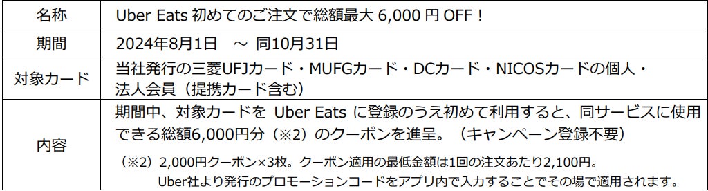 また、当社ではこの企画を機に、8月1日から10月31日まで、期間中に対象カードで Uber Eats を初めて利用すると、同サービスに使用できる総額6,000円分のクーポンを進呈するキャンペーン(詳細は下表ご参照)を実施します。当社では今後も、会員サービスの向上やお得なキャンペーンの展開により、当社カードの一層の利用促進を図っていきたいと考えているものです。