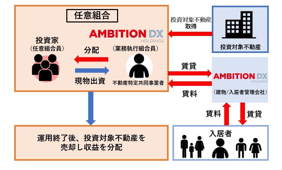 この度、当社が許可取得いたしました「任意組合型」の事業スキームは、投資家は当社と不動産売買契約を締結し、投資対象不動産の共有持分を取得し、売買契約と同時に当社を業務執行組合員とする任意組合契約を締結いたします。不動産の管理・運営については当社が行い、収益を共有持分の割合に応じて投資家へ分配いたします。また、運用終了後は投資不動産の売却を行い、清算を行うこととなります。