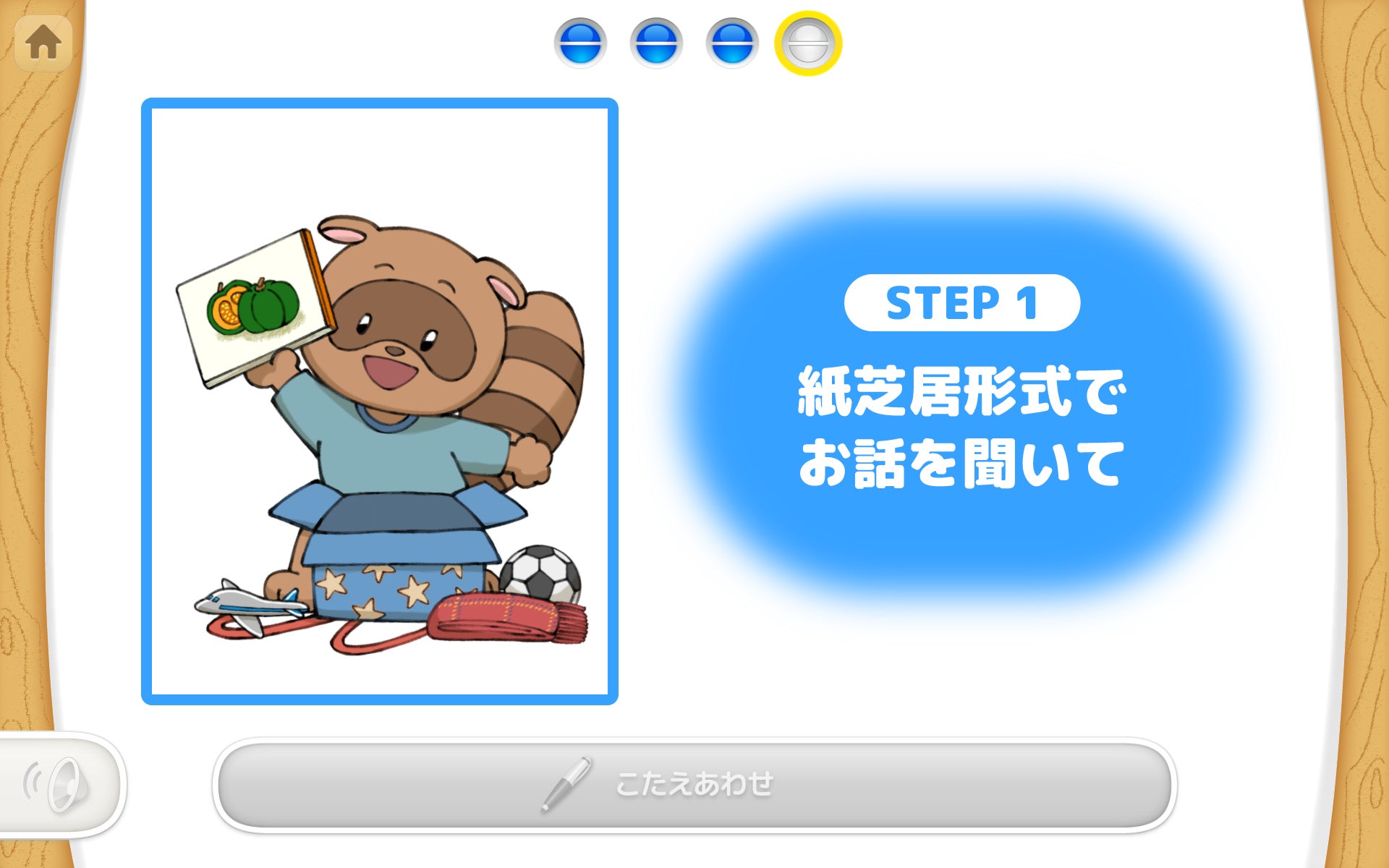 追加コンテンツは、小学校受験で「お話の記憶」として知られるコンテンツの入門レベルにあたるもので、音声で読み上げられる問題を、画像を見ながら聞き取り、解答するものです。