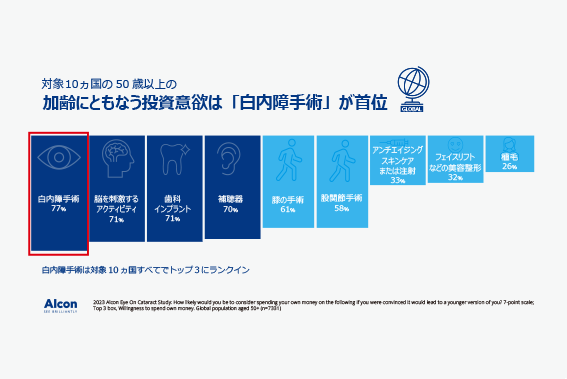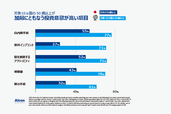 「アンチエイジングのためのスキンケアや注射」、「脳を刺激する活動」、「白内障手術」など、若返りにつながると確信できるなら、お金を使うことを考える可能性がどの程度あるか尋ねたところ、日本においても、10か国総合においても「白内障手術」が首位となり(図4および5)、対象の国のすべてで3位以内にランクインしました。50代以上の多くが、白内障を身近な問題として捉えていることが明るみになる結果となりました。