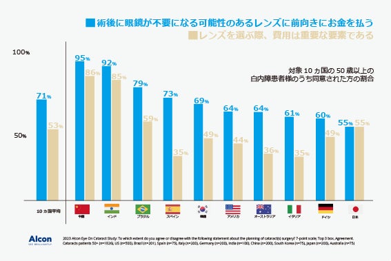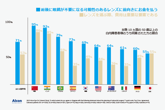 対象10か国のほとんどで、「術後に眼鏡が不要になる可能性のある眼内レンズに前向きにお金を払う」と回答する患者様が、「レンズを選ぶ際、費用は重要な要素である」と回答する患者様の割合を超える結果に