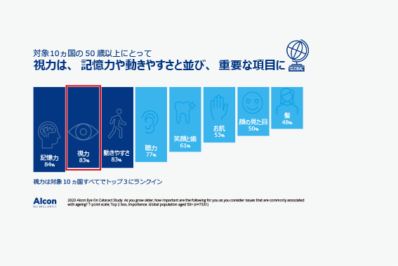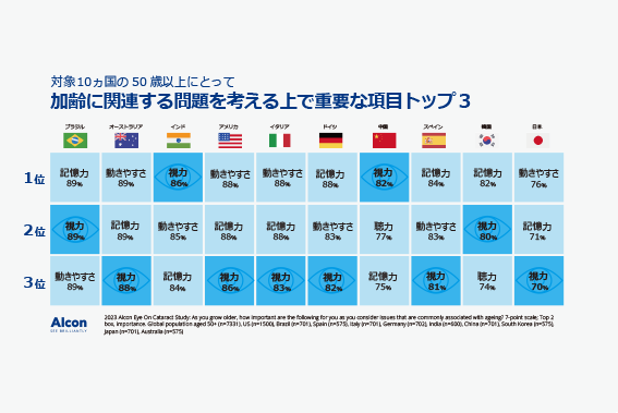 「視力」は、加齢に関連する問題を考える上で重要な項目として、対象10か国すべての国でトップ3項目にランクイン。10市場平均では、2番目に重要視される結果に