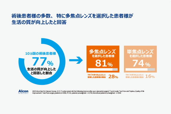 白内障手術後の患者様の多くが、手術後の生活の質(日本の患者様の72%、調査対象10か国総合の77%)および視力(日本の患者様、調査対象10か国総合のそれぞれ87%)が向上したと回答(図9)しました。また、10か国総合のデータでは、多焦点眼内レンズを選択した患者様において手術後の生活の質が向上したと回答する割合(81%)が、単焦点眼内レンズを選択した患者様(74%)と比較し、高くなりました(図10)。