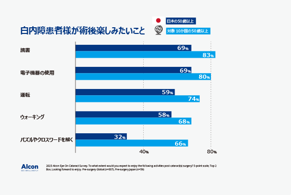 白内障患者様が術後楽しみたいことトップ3は、国内外で、「読書」「電子機器の使用」「運転」