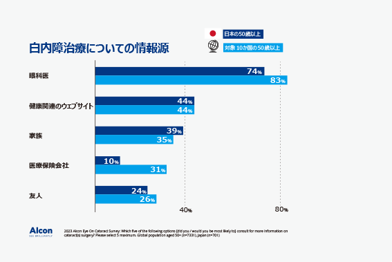 なお、白内障治療についての情報源として選ばれたのは、日本においても対象10か国総合においても「眼科医」が圧倒的首位となりました(図7)。この結果から、多くの人が、白内障罹患の際には、信頼のおける眼科医から白内障手術についての知識を得たいと考えていることがわかります。