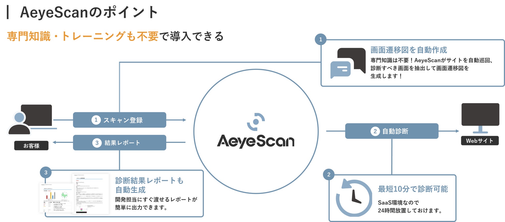 AeyeScanは、エーアイセキュリティラボが開発・提供している、セキュリティ人材の不足をAIで解決すべく開発されたクラウド型Webアプリケーション脆弱性診断ツールです。AIを活用した高度な診断シナリオの自動生成により、セキュリティの専門知識がなくても簡単に高精度なWeb脆弱性診断の内製化が可能となり、脆弱性診断の要員リソースやコストを大幅に削減します。