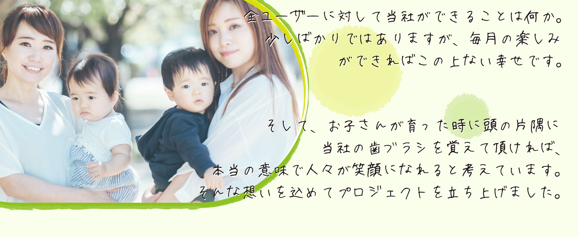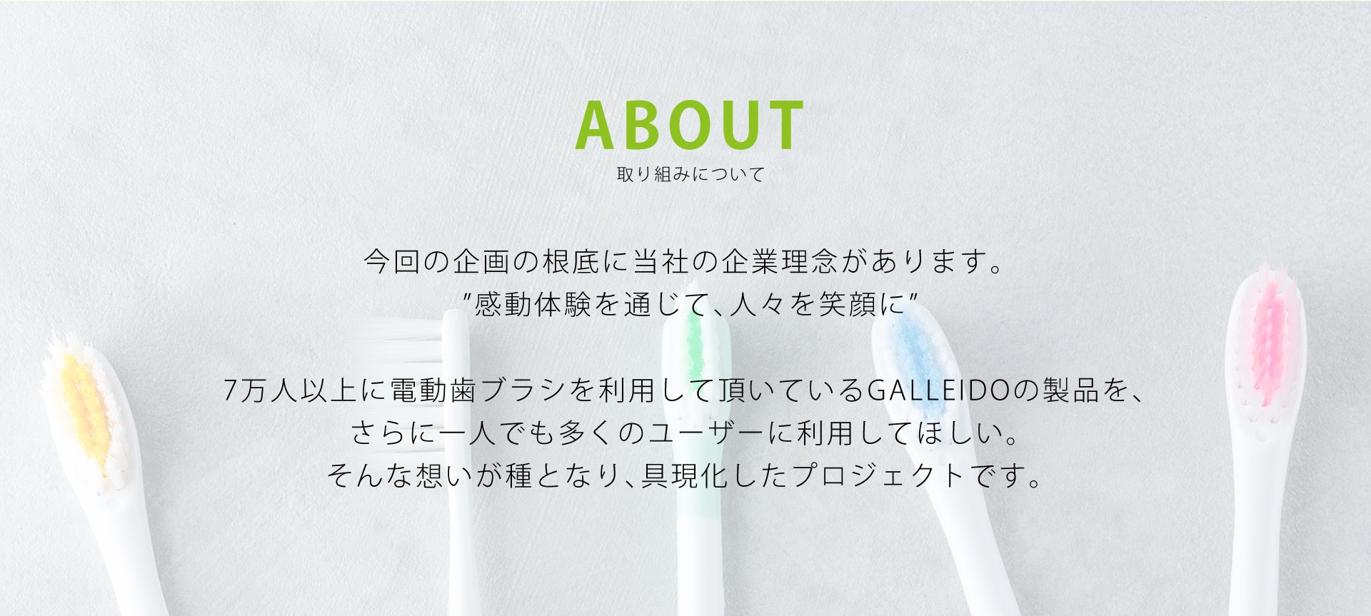 「感動体験を通じて人々を笑顔に」という経営理念を掲げています。また弊社の製品を一人でも多くの方にご利用頂くことを第一に考えています。 一方で、まだまだ小さい当社でも、少しでも社会に貢献できることはないか?そこで考えついたのが、「GALLEIDO ひとり親応援プロジェクト」です。 将来、本プロジェクトでGALLEIDOの歯ブラシを使っていたお子様が、大人になってもGALLEIDOの歯ブラシを使って頂けたら、この上ない喜びです。
