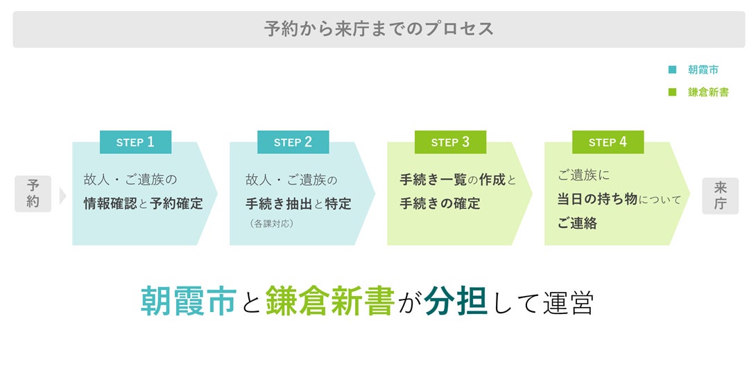 当社は、朝霞市がご遺族支援コーナーの運営を実施するために必要な支援を行うことで、多岐にわたるおくやみに関する手続きの負担を軽減し、行政サービスの充実と質的向上をこれからも支援してまいります。