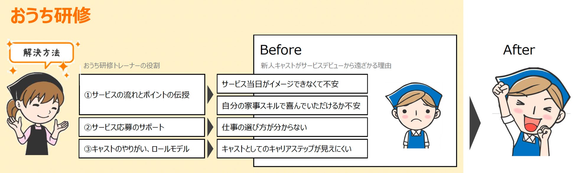 しかしながら、未経験で家事代行を始めるキャストは、「リアルなサービスのイメージができない」「家事代行という職業のキャリアステップが見えにくい」などの不安を感じる方が多く、職業定着の妨げとなっている一因と考えられます。