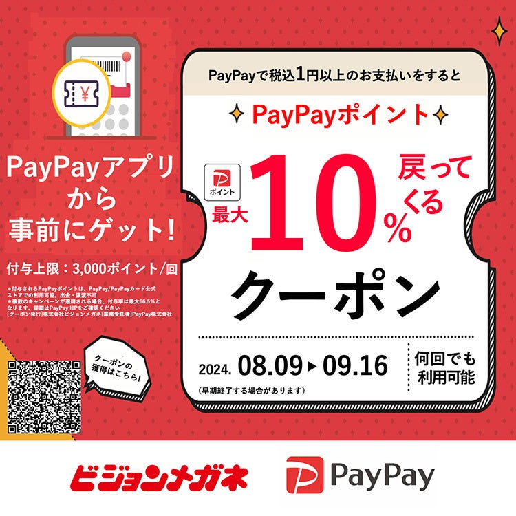 全国で眼鏡専門店を運営する(株)ビジョンメガネ https://www.vision-megane.co.jp/ (大阪市)は、スマートフォン決済サービス「PayPay(ペイペイ)」の利用で、最大10%のPayPayポイントを付与するキャンペーンを開催します。期間は、2024年8月9日(金)~9月16日(月・祝)です。対象店舗は、全国の「ビジョンメガネ」及び「eyevory by(アイボリー バイ)ビジョンメガネ」の98店舗です。