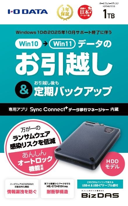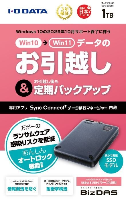 株式会社アイ・オー・データ機器(本社:石川県金沢市、代表取締役会長:細野 昭雄、以下、アイ・オー・データ)は、Windows 10サポート終了に伴い発生するPC間のデータ移行を簡単に行えるデータ移行アプリ「Sync Connect⁺ データ移行マネージャー」を内蔵したポータブルSSD・HDD「SSPD-SUTC/S・HDPD-SUTC/S」を、本日2024年9月4日(水)に発表いたします。