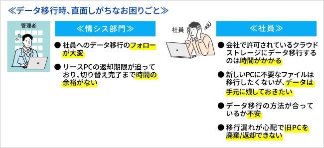 情シス部門の方にとっては、社員全員分のPCリプレイスおよびデータ移行のフォロー業務が発生します。リースPCを使用している場合は返却期限が迫り、切り替え完了まで時間の余裕がない事態に陥ることも考えられます。