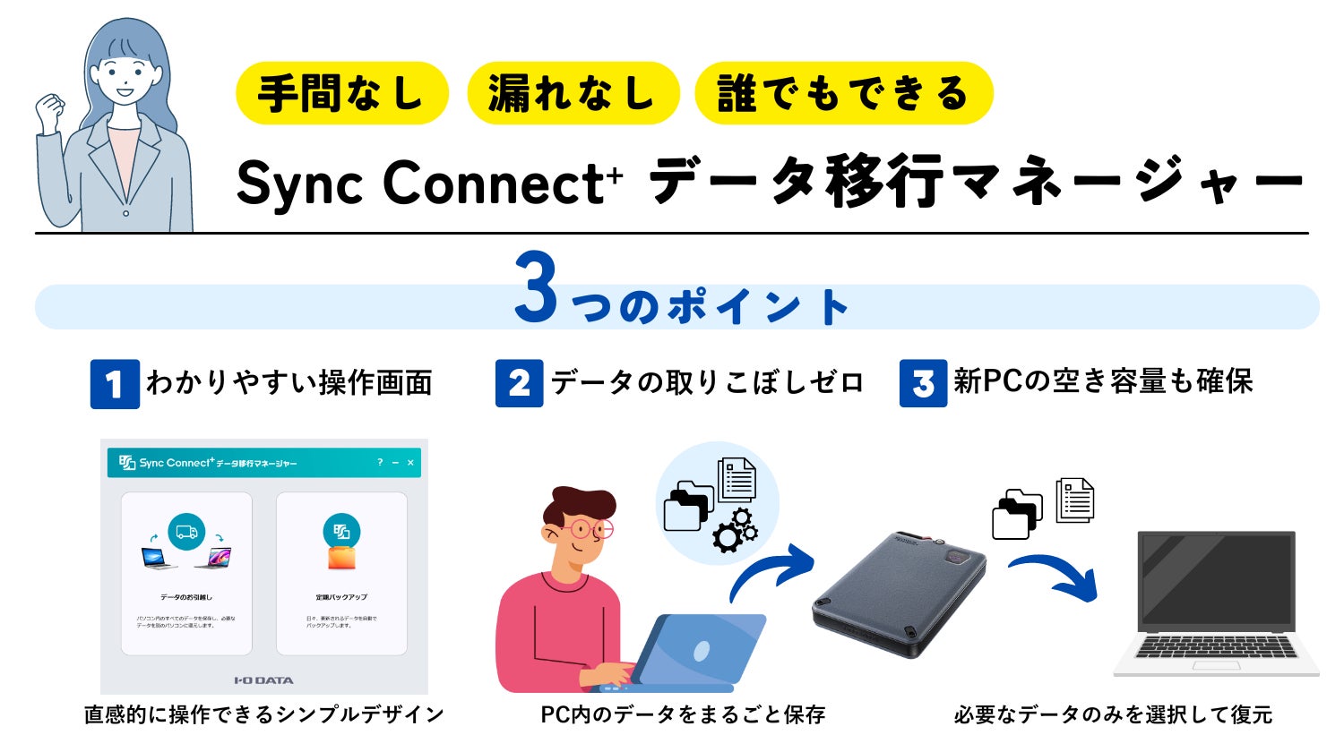 かんたんデータ移行アプリ「Sync Connect⁺ データ移行マネージャー」は、9月下旬より無償で提供を開始します。対応機種は、アイ・オー・データ機器製SSD・HDDです。