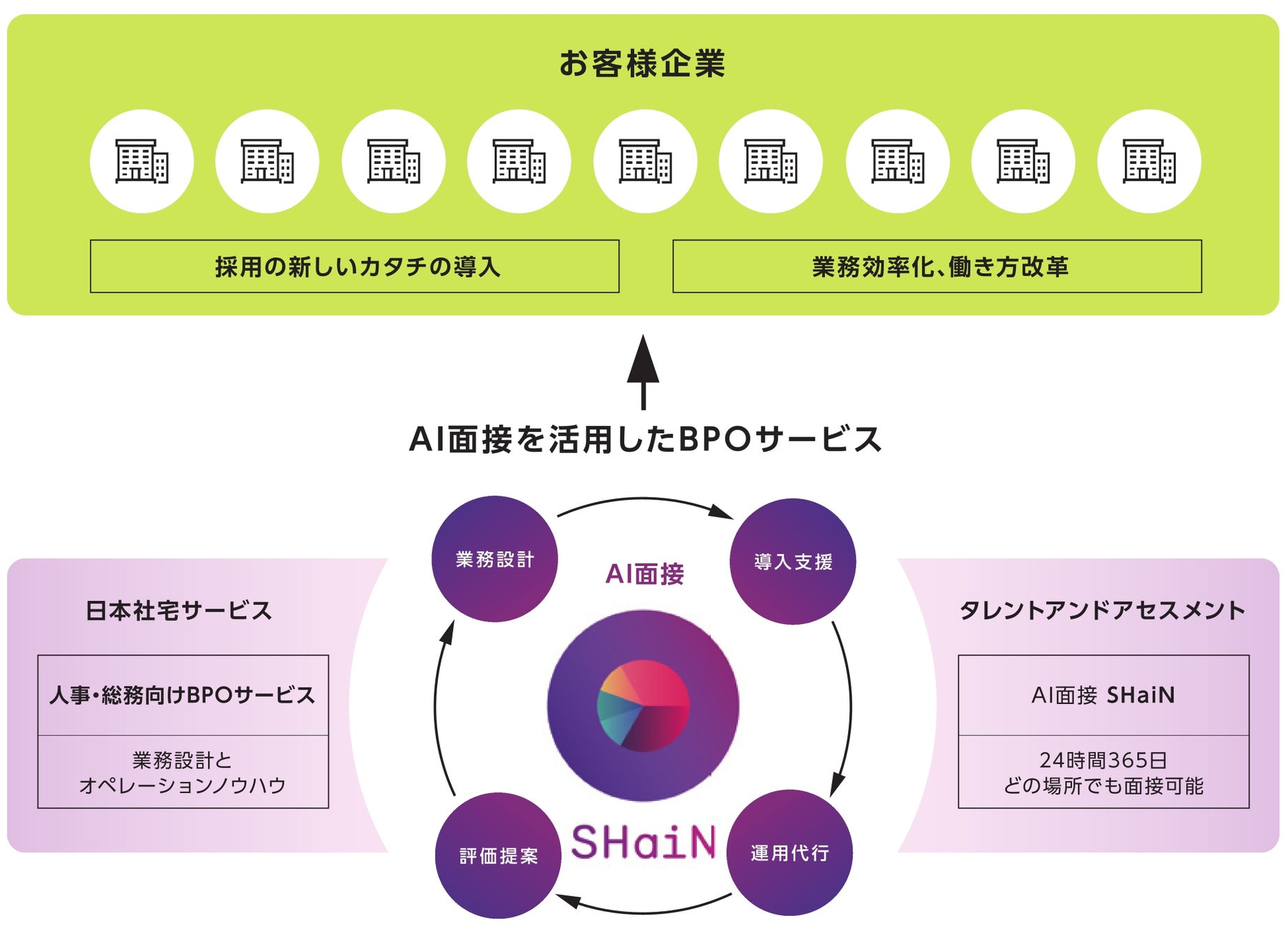 ⽇本社宅サービスが⼿がける「⼈事・総務向けBPO サービス」と、タレントアンドアセスメントが提供する対話型AI ⾯接サービス「SHaiN(シャイン)」を組み合わせた共同サービスを開発することにより、AI を活⽤した最適な採⽤プロセスとBPOを活⽤した効率的なオペレーションを実現し、企業ごとに異なる“採⽤の新しいカタチ”の創造に向け取り組んでまいります。