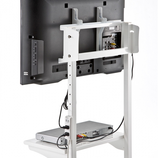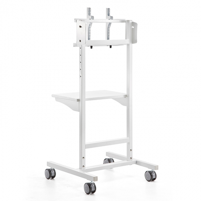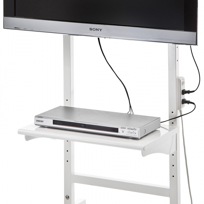 ディスプレイ本体の他、レコーダーやプレーヤーなども設置できる棚板付きで、別途サブテーブルなどを用意する必要がなく一緒に設置可能です。棚板の高さも41~61cmで調整可能です。スタンドの移動時に便利なキャスターを標準装備しています。直径75mmの比較的大きめのキャスターで、軽い力で楽に移動が可能です。前2つのキャスターにはストッパーが付いているので、設置した際に不意に動くことなく安心して使用できます。金属フレームを採用しているので強度があり、マグネットタイプの電源タップなどを設置することができます。