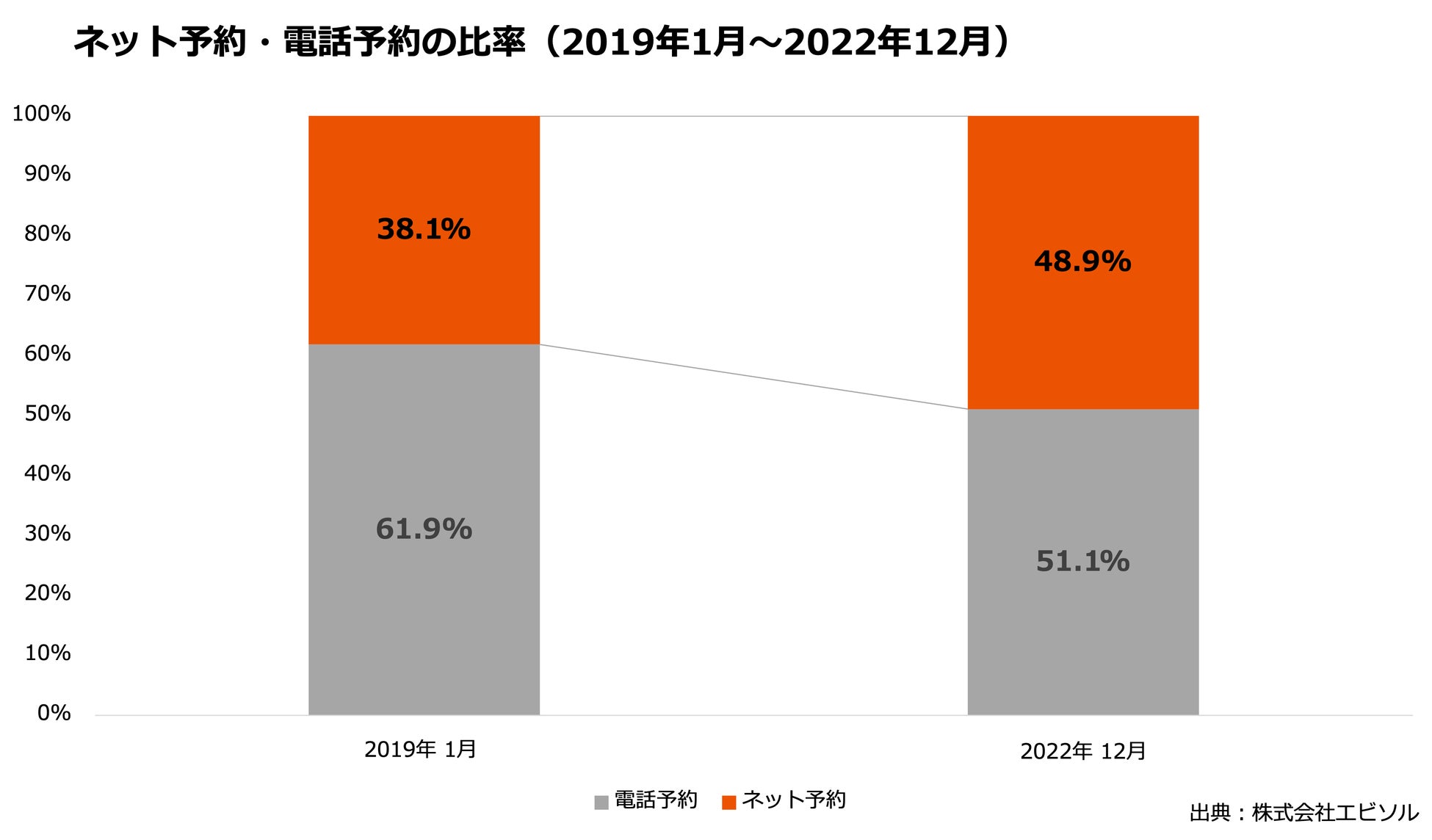 全国の飲食店の予約データを基に、ネット予約と電話予約の比率の推移を見ると、2022年12月ではネット予約が48.9%、電話予約が51.1%となりました。コロナ禍以前の2019年と比較すると、2019年1月はネット予約が38.1%、電話予約が61.9%と、10.8ポイントもの差があることがわかります。