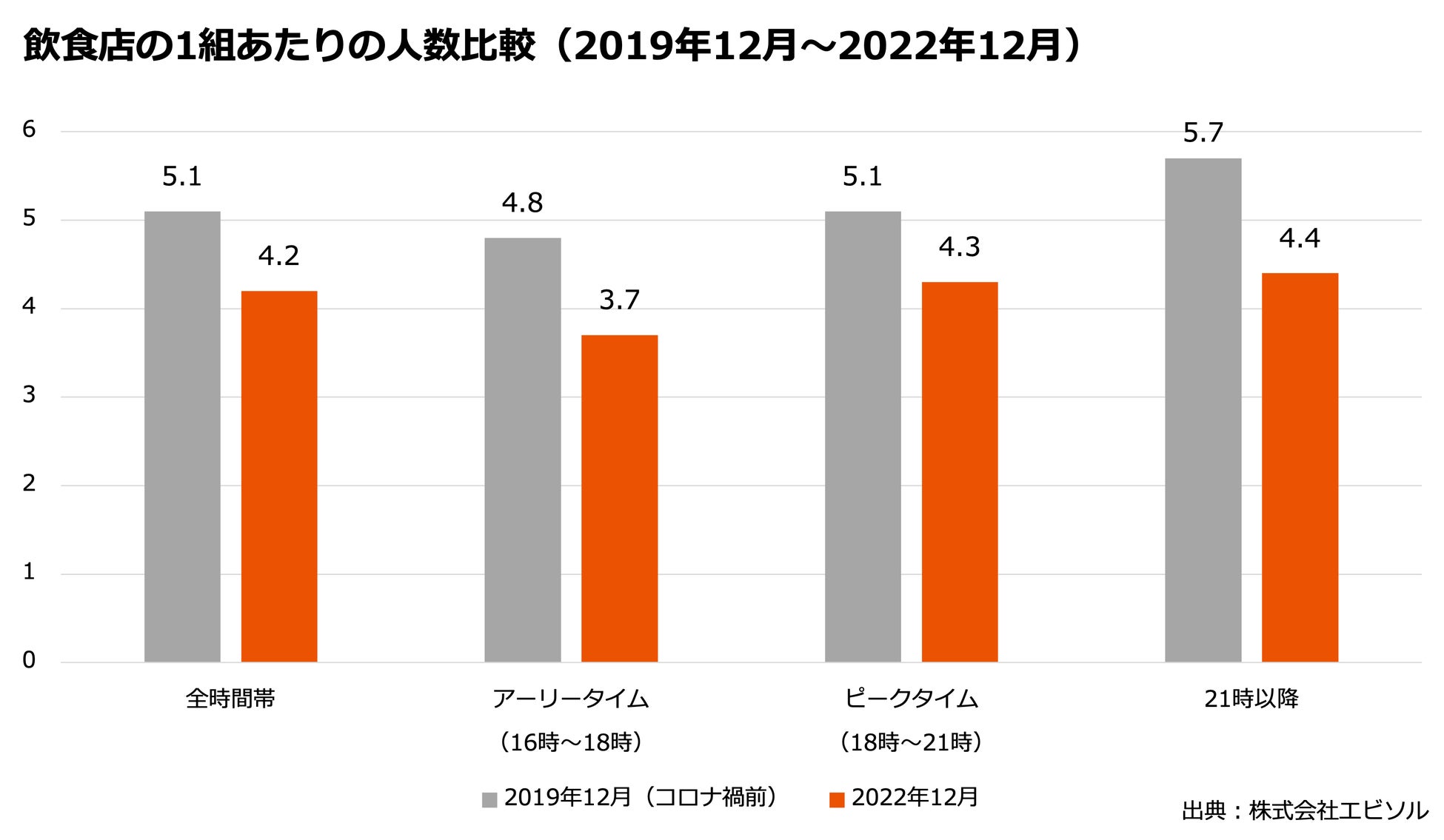 - 2022年はコロナ禍以前に比べ、全ての時間帯で1組あたりの人数が平均約1人分減少しているなど、少人数の外食が増加