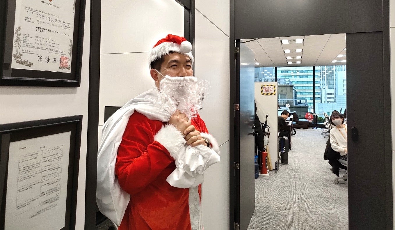 オフィスにサンタ(代表)登場、育児の苦労も労う