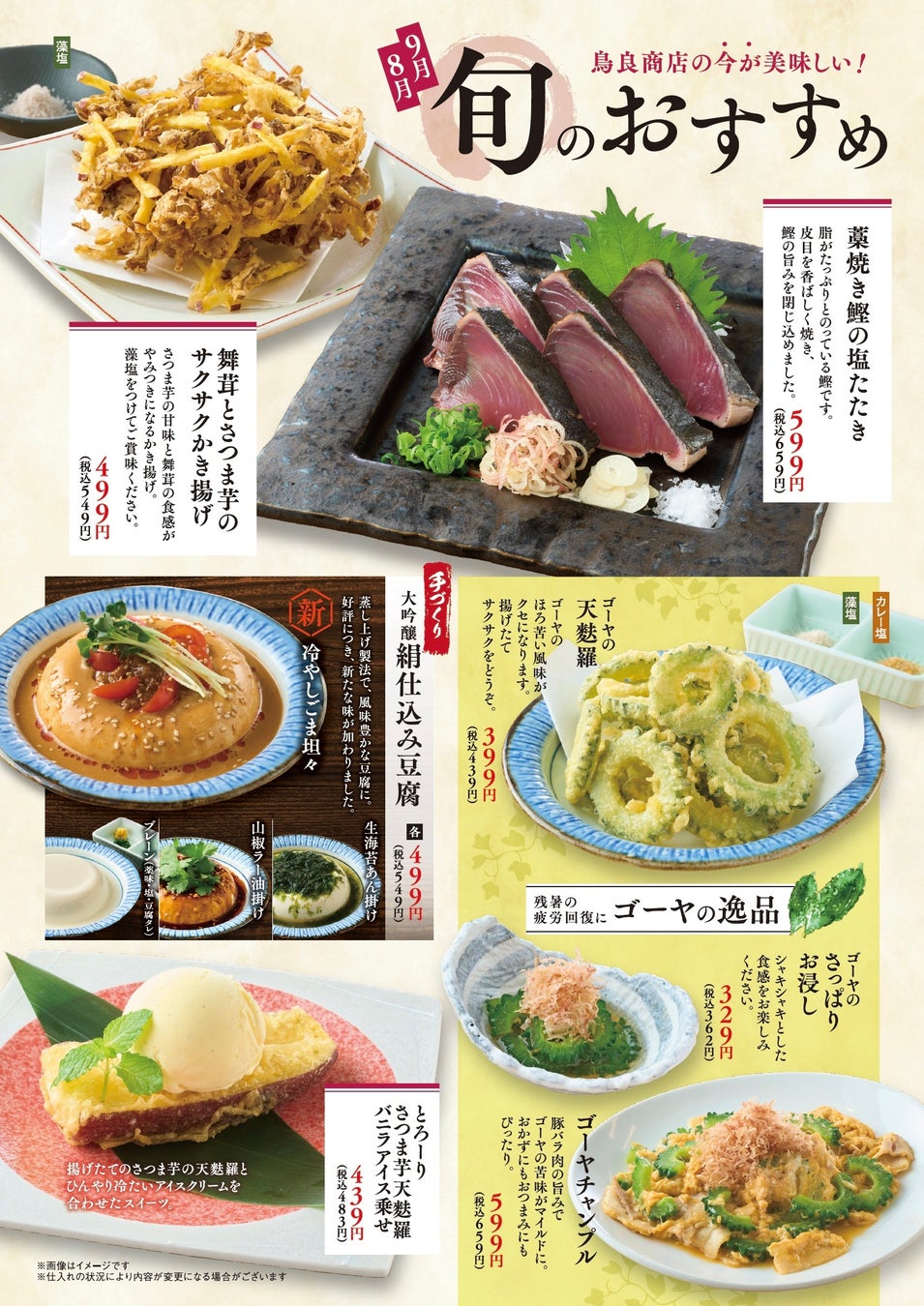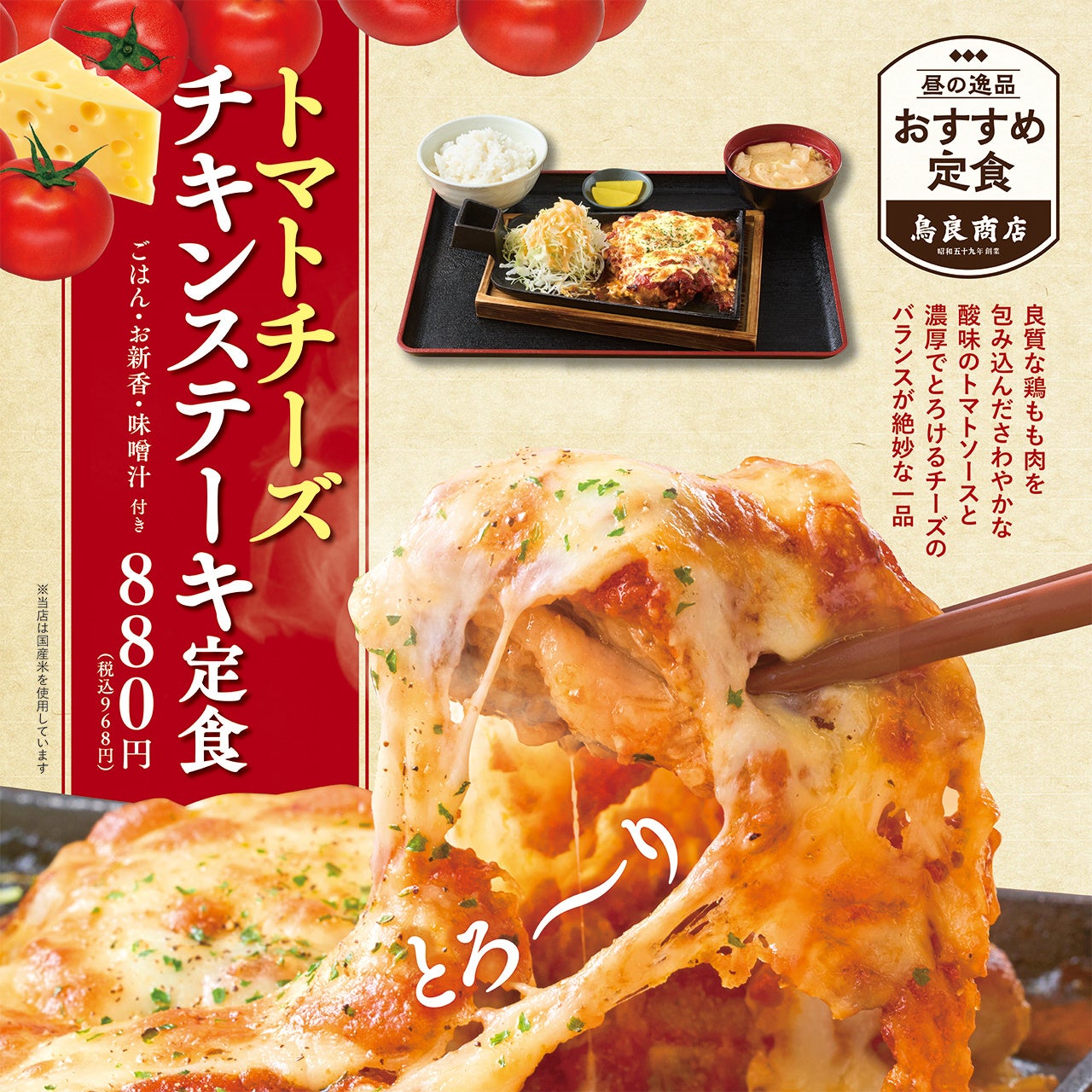 鳥良商店の8月・9月のおすすめ! 夏にぴったりの「ゴーヤ」や秋を感じる「鰹」や「さつまいも」のメニューを販売ランチは酸味の効いたトマトソースと濃厚でとろけるチーズの【トマトチーズチキンステーキ】が登場