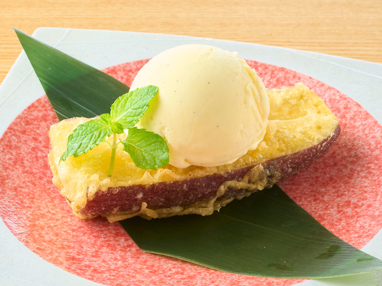 揚げたてのさつめ芋の天麩羅とひんやり冷たいバニラアイスクリームを合わせたスイーツ♪
