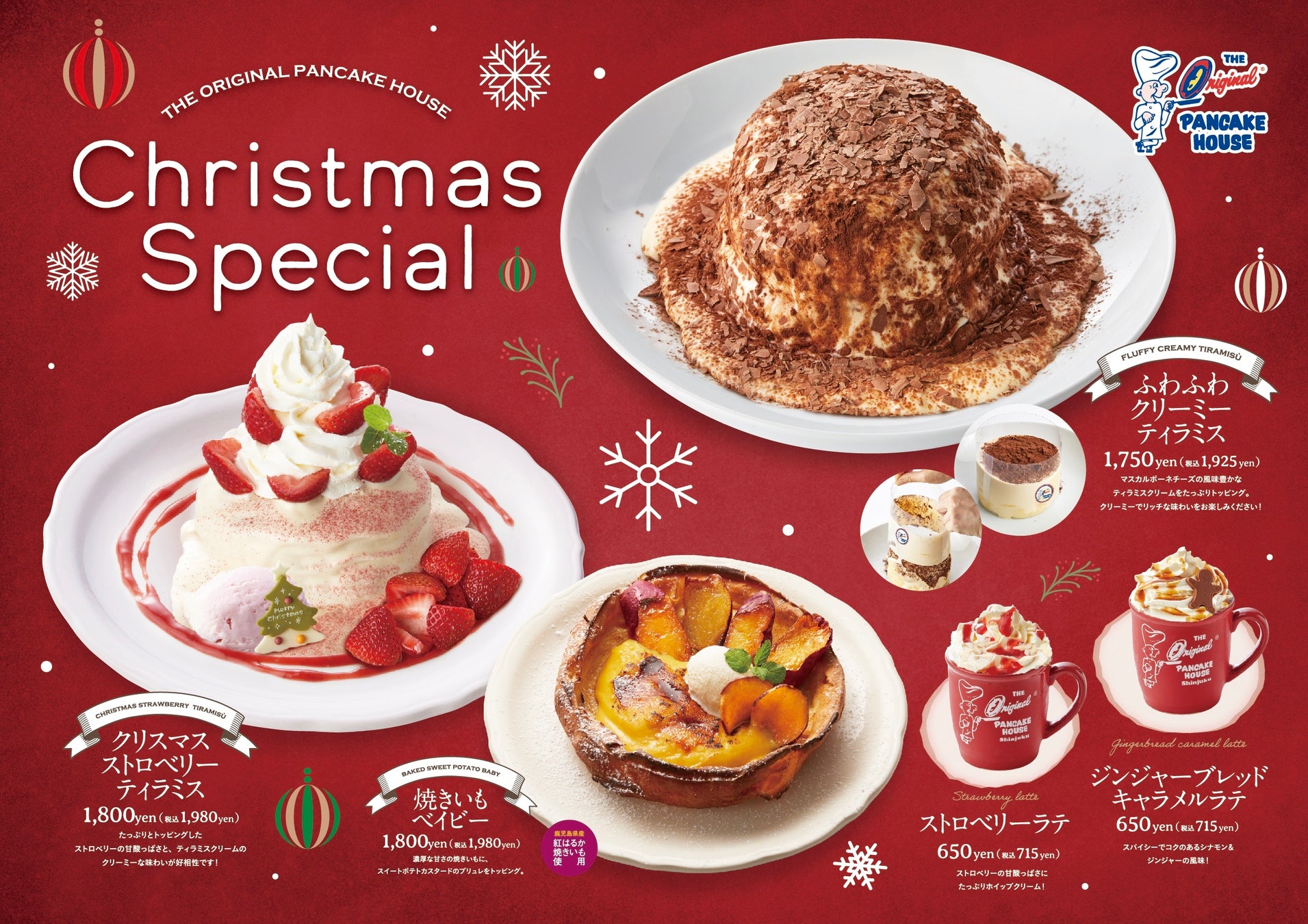 「見て幸せ。食べてもっと幸せ。」 オリジナルパンケーキハウスの今回の新作は、クリーミーでリッチな味わいの特製ティラミスソースをふんだんに使った新作パンケーキと、寒い季節にぴったりのジンジャーブレッドキャラメルラテなどの新作ドリンクをご用意しました。クリスマス、ホリデーシーズンを彩る期間限定の特別な味わいです。今だけのおいしさをぜひお楽しみください。