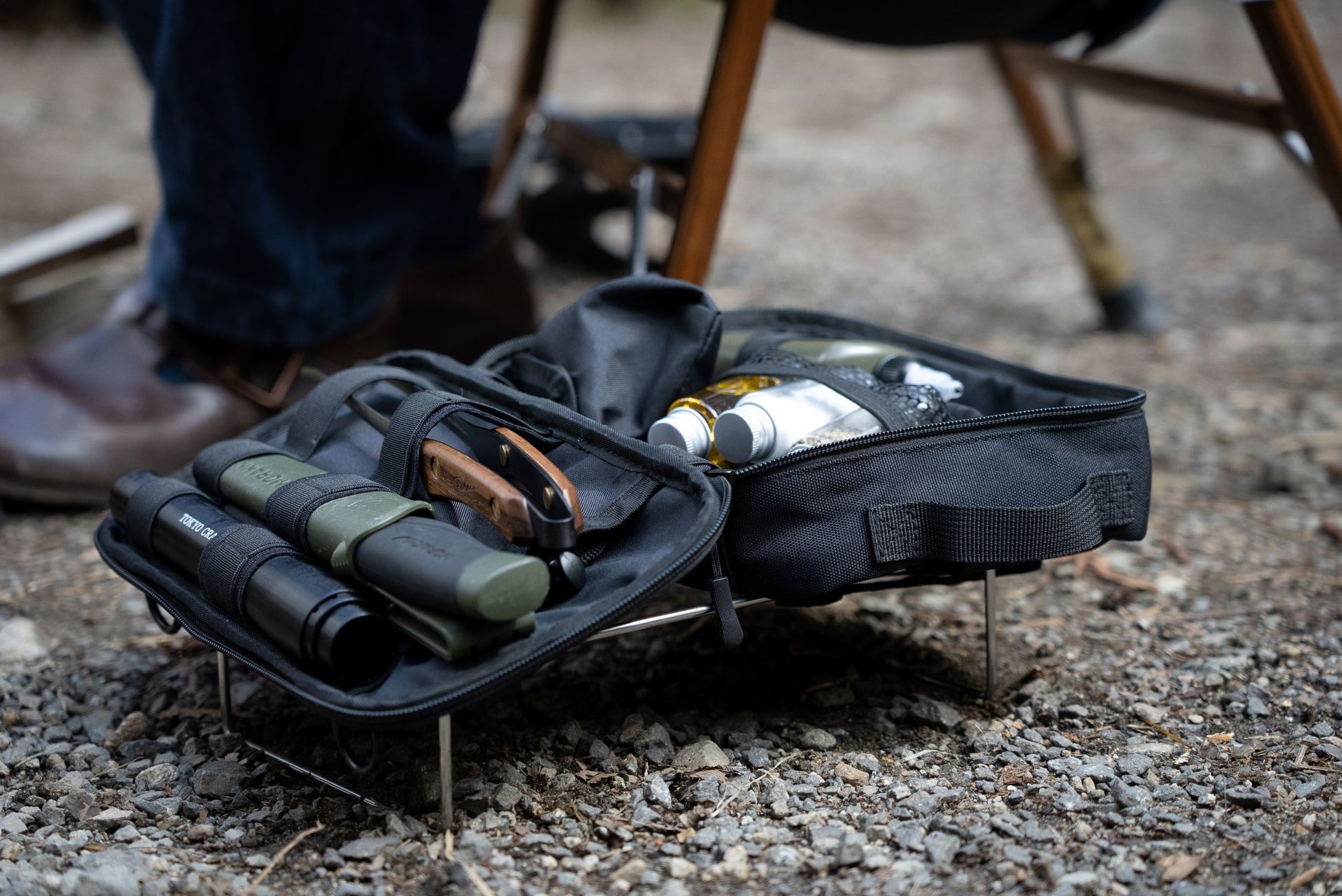 長さ25cmまで収納ができ、シースナイフや折り畳みのノコギリもしっかり収まります。様々なキャンプシーンでの使用することを想定し、必要なギアが効率よく収まるよう設計されています。