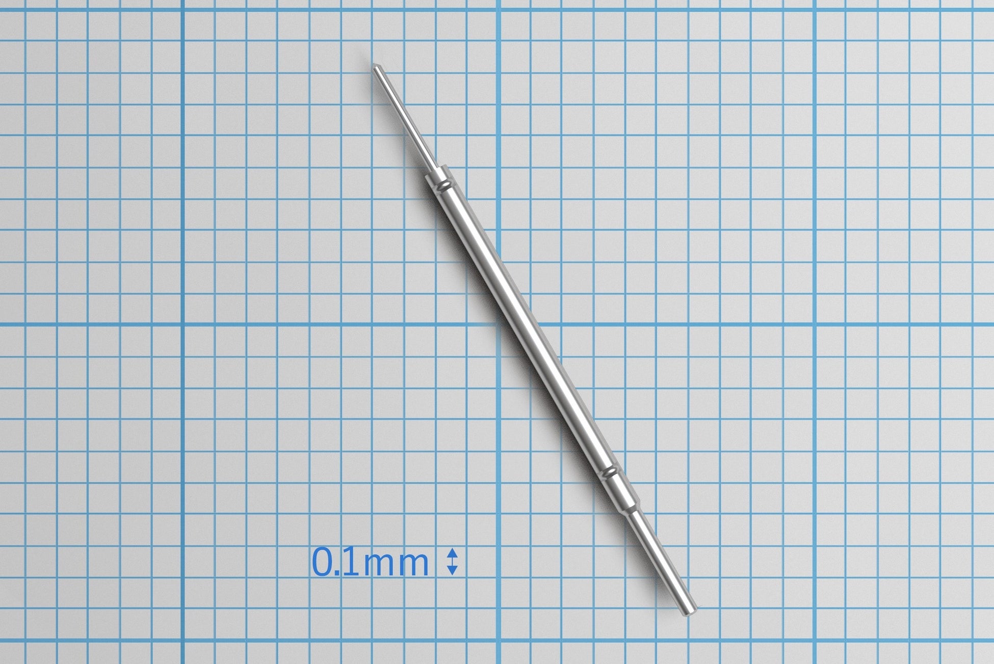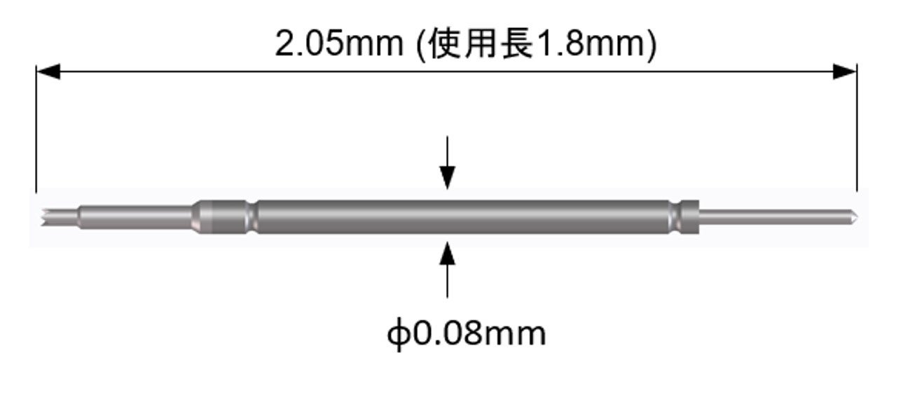 本製品は、半導体製造の前工程検査で使用するプローブで、大量のチップが印刷されたシリコンウェハの電気検査に使用されます。 プローブは、上下のピン(プランジャー)とチューブ(バレル)、スプリングの4つの部品で構成されており、ピンを押すとチューブの中に組み込まれたばねが伸び縮みする仕組みになっています。